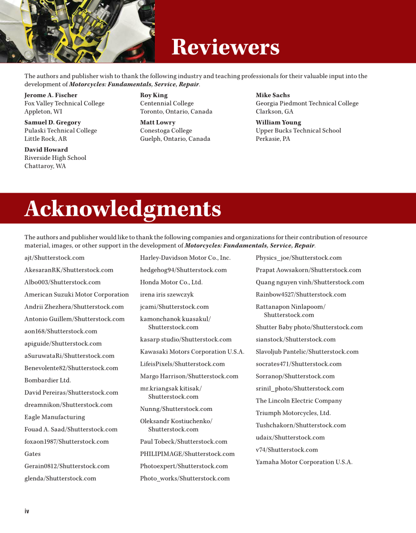 iv The authors and publisher wish to thank the following industry and teaching professionals for their valuable input into the development of Motorcycles: Fundamentals, Service, Repair. Jerome A. Fischer Fox Valley Technical College Appleton, WI Samuel D. Gregory Pulaski Technical College Little Rock, AR David Howard Riverside High School Chattaroy, WA Roy King Centennial College Toronto, Ontario, Canada Matt Lowry Conestoga College Guelph, Ontario, Canada Mike Sachs Georgia Piedmont Technical College Clarkson, GA William Young Upper Bucks Technical School Perkasie, PA Reviewers The authors and publisher would like to thank the following companies and organizations for their contribution of resource material, images, or other support in the development of Motorcycles: Fundamentals, Service, Repair. ajt/Shutterstock.com AkesaranRK/Shutterstock.com Albo003/Shutterstock.com American Suzuki Motor Corporation Andrii Zhezhera/Shutterstock.com Antonio Guillem/Shutterstock.com aon168/Shutterstock.com apiguide/Shutterstock.com aSuruwataRi/Shutterstock.com Benevolente82/Shutterstock.com Bombardier Ltd. David Pereiras/Shutterstock.com dreamnikon/Shutterstock.com Eagle Manufacturing Fouad A. Saad/Shutterstock.com foxaon1987/Shutterstock.com Gates Gerain0812/Shutterstock.com glenda/Shutterstock.com Harley-Davidson Motor Co., Inc. hedgehog94/Shutterstock.com Honda Motor Co., Ltd. irena iris szewczyk jcami/Shutterstock.com kamonchanok kuasakul/ Shutterstock.com kasarp studio/Shutterstock.com Kawasaki Motors Corporation U.S.A. LifeisPixels/Shutterstock.com Margo Harrison/Shutterstock.com mr.kriangsak kitisak/ Shutterstock.com Nunng/Shutterstock.com Oleksandr Kostiuchenko/ Shutterstock.com Paul Tobeck/Shutterstock.com PHILIPIMAGE/Shutterstock.com Photoexpert/Shutterstock.com Photo_works/Shutterstock.com Physics_joe/Shutterstock.com Prapat Aowsakorn/Shutterstock.com Quang nguyen vinh/Shutterstock.com Rainbow4527/Shutterstock.com Rattanapon Ninlapoom/ Shutterstock.com Shutter Baby photo/Shutterstock.com sianstock/Shutterstock.com Slavoljub Pantelic/Shutterstock.com socrates471/Shutterstock.com Sorranop/Shutterstock.com srinil_photo/Shutterstock.com The Lincoln Electric Company Triumph Motorcycles, Ltd. Tushchakorn/Shutterstock.com udaix/Shutterstock.com v74/Shutterstock.com Yamaha Motor Corporation U.S.A. Acknowledgments