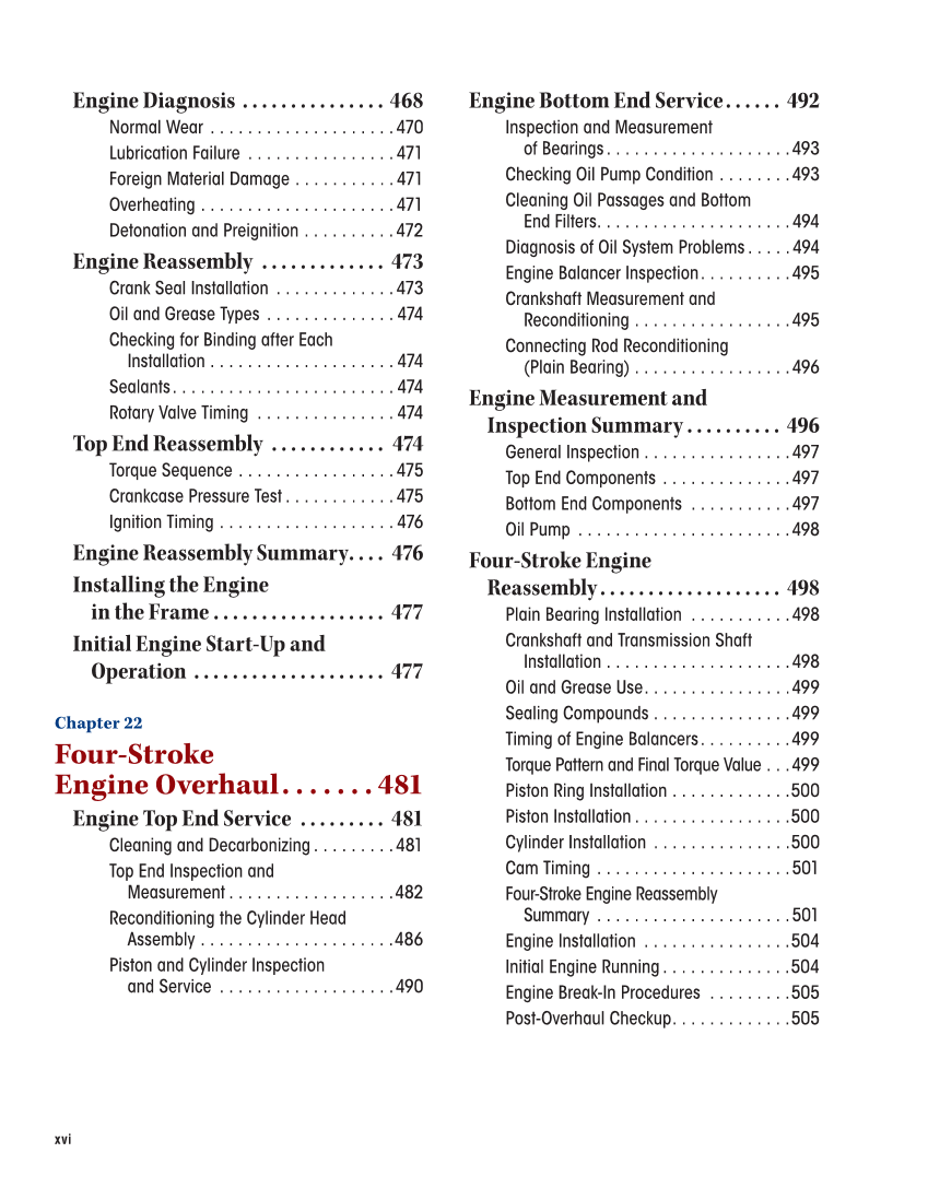 xvi Engine Diagnosis . . . . . . . . . . . . . . . 468 Normal Wear . . . . . . . . . . . . . . . . . . . .470 Lubrication Failure . . . . . . . . . . . . . . . .471 Foreign Material Damage . . . . . . . . . . .471 Overheating . . . . . . . . . . . . . . . . . . . . .471 Detonation and Preignition . . . . . . . . . .472 Engine Reassembly . . . . . . . . . . . . . 473 Crank Seal Installation . . . . . . . . . . . . .473 Oil and Grease Types . . . . . . . . . . . . . . 474 Checking for Binding after Each Installation . . . . . . . . . . . . . . . . . . . . 474 Sealants. . . . . . . . . . . . . . . . . . . . . . . . 474 Rotary Valve Timing . . . . . . . . . . . . . . . 474 Top End Reassembly . . . . . . . . . . . . 474 Torque Sequence . . . . . . . . . . . . . . . . .475 Crankcase Pressure Test . . . . . . . . . . . .475 Ignition Timing . . . . . . . . . . . . . . . . . . . 476 Engine Reassembly Summary. . . . 476 Installing the Engine in the Frame . . . . . . . . . . . . . . . . . . 477 Initial Engine Start-Up and Operation . . . . . . . . . . . . . . . . . . . . 477 Chapter 22 Four-Stroke Engine Overhaul. . . . . . . 481 Engine Top End Service . . . . . . . . . 481 Cleaning and Decarbonizing . . . . . . . . .481 Top End Inspection and Measurement . . . . . . . . . . . . . . . . . .482 Reconditioning the Cylinder Head Assembly . . . . . . . . . . . . . . . . . . . . .486 Piston and Cylinder Inspection and Service . . . . . . . . . . . . . . . . . . .490 Engine Bottom End Service. . . . . . 492 Inspection and Measurement of Bearings. . . . . . . . . . . . . . . . . . . .493 Checking Oil Pump Condition . . . . . . . .493 Cleaning Oil Passages and Bottom End Filters. . . . . . . . . . . . . . . . . . . . .494 Diagnosis of Oil System Problems . . . . .494 Engine Balancer Inspection. . . . . . . . . .495 Crankshaft Measurement and Reconditioning . . . . . . . . . . . . . . . . .495 Connecting Rod Reconditioning (Plain Bearing) . . . . . . . . . . . . . . . . .496 Engine Measurement and Inspection Summary . . . . . . . . . . 496 General Inspection . . . . . . . . . . . . . . . .497 Top End Components . . . . . . . . . . . . . .497 Bottom End Components . . . . . . . . . . .497 Oil Pump . . . . . . . . . . . . . . . . . . . . . . .498 Four-Stroke Engine Reassembly . . . . . . . . . . . . . . . . . . . 498 Plain Bearing Installation . . . . . . . . . . .498 Crankshaft and Transmission Shaft Installation . . . . . . . . . . . . . . . . . . . .498 Oil and Grease Use. . . . . . . . . . . . . . . .499 Sealing Compounds . . . . . . . . . . . . . . .499 Timing of Engine Balancers. . . . . . . . . .499 Torque Pattern and Final Torque Value . . .499 Piston Ring Installation . . . . . . . . . . . . .500 Piston Installation . . . . . . . . . . . . . . . . .500 Cylinder Installation . . . . . . . . . . . . . . .500 Cam Timing . . . . . . . . . . . . . . . . . . . . .501 Four-Stroke Engine Reassembly Summary . . . . . . . . . . . . . . . . . . . . .501 Engine Installation . . . . . . . . . . . . . . . .504 Initial Engine Running . . . . . . . . . . . . . .504 Engine Break-In Procedures . . . . . . . . .505 Post-Overhaul Checkup. . . . . . . . . . . . .505
