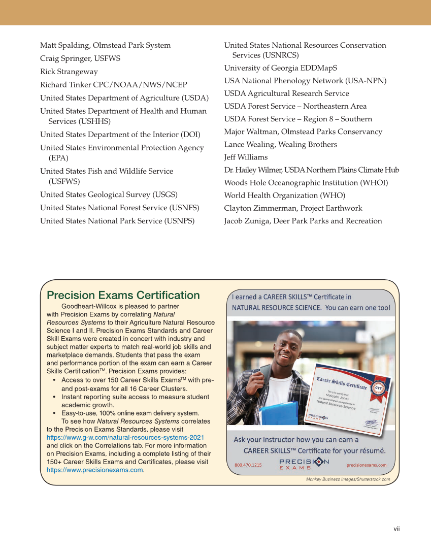 vii Matt Spalding, Olmstead Park System Craig Springer, USFWS Rick Strangeway Richard Tinker CPC/NOAA/NWS/NCEP United States Department of Agriculture (USDA) United States Department of Health and Human Services (USHHS) United States Department of the Interior (DOI) United States Environmental Protection Agency (EPA) United States Fish and Wildlife Service (USFWS) United States Geological Survey (USGS) United States National Forest Service (USNFS) United States National Park Service (USNPS) United States National Resources Conservation Services (USNRCS) University of Georgia EDDMapS USA National Phenology Network (USA-NPN) USDA Agricultural Research Service USDA Forest Service – Northeastern Area USDA Forest Service – Region 8 – Southern Major Waltman, Olmstead Parks Conservancy Lance Wealing, Wealing Brothers Jeff Williams Dr. Hailey Wilmer, USDA Northern Plains Climate Hub Woods Hole Oceanographic Institution (WHOI) World Health Organization (WHO) Clayton Zimmerman, Project Earthwork Jacob Zuniga, Deer Park Parks and Recreation Precision Exams Certifi cation Goodheart-Willcox is pleased to partner with Precision Exams by correlating Natural Resources Systems to their Agriculture Natural Resource Science I and II. Precision Exams Standards and Career Skill Exams were created in concert with industry and subject matter experts to match real-world job skills and marketplace demands. Students that pass the exam and performance portion of the exam can earn a Career Skills CertificationTM. Precision Exams provides: • Access to over 150 Career Skills ExamsTM with pre- and post-exams for all 16 Career Clusters. • Instant reporting suite access to measure student academic growth. • Easy-to-use, 100% online exam delivery system. To see how Natural Resources Systems correlates to the Precision Exams Standards, please visit https://www.g-w.com/natural-resources-systems-2021 and click on the Correlations tab. For more information on Precision Exams, including a complete listing of their 150+ Career Skills Exams and Certificates, please visit https://www.precisionexams.com. Monkey Business Images/Shutterstock.com