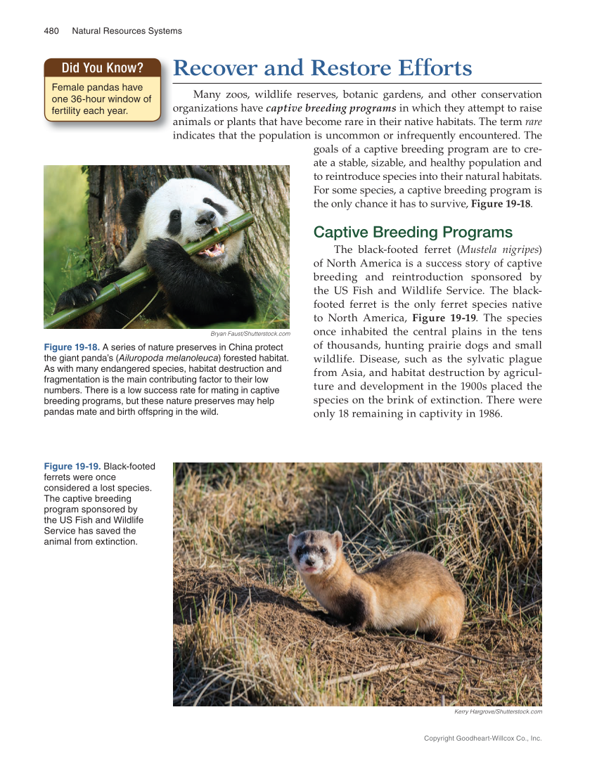 480 Natural Resources Systems Copyright Goodheart-Willcox Co., Inc. Recover and Restore Efforts Many zoos, wildlife reserves, botanic gardens, and other conservation organizations have captive breeding programs in which they attempt to raise animals or plants that have become rare in their native habitats. The term rare indicates that the population is uncommon or infrequently encountered. The goals of a captive breeding program are to cre- ate a stable, sizable, and healthy population and to reintroduce species into their natural habitats. For some species, a captive breeding program is the only chance it has to survive, Figure 19-18. Captive Breeding Programs The black-footed ferret (Mustela nigripes) of North America is a success story of captive breeding and reintroduction sponsored by the US Fish and Wildlife Service. The black- footed ferret is the only ferret species native to North America, Figure 19-19. The species once inhabited the central plains in the tens of thousands, hunting prairie dogs and small wildlife. Disease, such as the sylvatic plague from Asia, and habitat destruction by agricul- ture and development in the 1900s placed the species on the brink of extinction. There were only 18 remaining in captivity in 1986. Female pandas have one 36-hour window of fertility each year. Did You Know? Bryan Faust/Shutterstock.com Figure 19-18. A series of nature preserves in China protect the giant panda’s (Ailuropoda melanoleuca) forested habitat. As with many endangered species, habitat destruction and fragmentation is the main contributing factor to their low numbers. There is a low success rate for mating in captive breeding programs, but these nature preserves may help pandas mate and birth offspring in the wild. Figure 19-19. Black-footed ferrets were once considered a lost species. The captive breeding program sponsored by the US Fish and Wildlife Service has saved the animal from extinction. Kerry Hargrove/Shutterstock.com