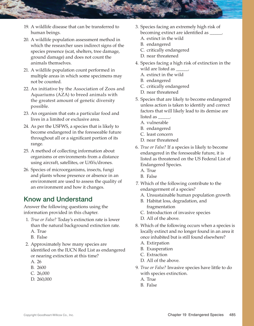 Chapter 19 Endangered Species 485 Copyright Goodheart-Willcox Co., Inc. 19. A wildlife disease that can be transferred to human beings. 20. A wildlife population assessment method in which the researcher uses indirect signs of the species presence (scat, shelters, tree damage, ground damage) and does not count the animals themselves. 21. A wildlife population count performed in multiple areas in which some specimens may not be counted. 22. An initiative by the Association of Zoos and Aquariums (AZA) to breed animals with the greatest amount of genetic diversity possible. 23. An organism that eats a particular food and lives in a limited or exclusive area. 24. As per the USFWS, a species that is likely to become endangered in the foreseeable future throughout all or a signifi cant portion of its range. 25. A method of collecting information about organisms or environments from a distance using aircraft, satellites, or UAVs/drones. 26. Species of microorganisms, insects, fungi and plants whose presence or absence in an environment are used to assess the quality of an environment and how it changes. Know and Understand Answer the following questions using the information provided in this chapter. 1. True or False? Today’s extinction rate is lower than the natural background extinction rate. A. True B. False 2. Approximately how many species are identifi ed on the IUCN Red List as endangered or nearing extinction at this time? A. 26 B. 2600 C. 26,000 D. 260,000 3. Species facing an extremely high risk of becoming extinct are identifi ed as ______. A. extinct in the wild B. endangered C. critically endangered D. near threatened 4. Species facing a high risk of extinction in the wild are listed as ______. A. extinct in the wild B. endangered C. critically endangered D. near threatened 5. Species that are likely to become endangered unless action is taken to identify and correct factors that will likely lead to its demise are listed as _____. A. vulnerable B. endangered C. least concern D. near threatened 6. True or False? If a species is likely to become endangered in the foreseeable future, it is listed as threatened on the US Federal List of Endangered Species. A. True B. False 7. Which of the following contribute to the endangerment of a species? A. Unsustainable human population growth B. Habitat loss, degradation, and fragmentation C. Introduction of invasive species D. All of the above. 8. Which of the following occurs when a species is locally extinct and no longer found in an area it once inhabited but is still found elsewhere? A. Extirpation B. Exasperation C. Extraction D. All of the above. 9. True or False? Invasive species have little to do with species extinction. A. True B. False