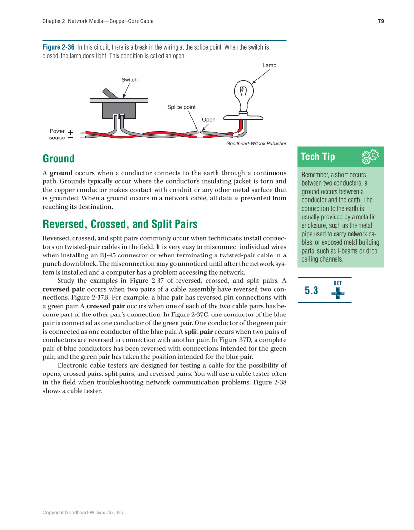 Copyright Goodheart-Willcox Co., Inc. 79 Chapter 2 Network Media—Copper-Core Cable Ground A ground occurs when a conductor connects to the earth through a continuous path. Grounds typically occur where the conductor’s insulating jacket is torn and the copper conductor makes contact with conduit or any other metal surface that is grounded. When a ground occurs in a network cable, all data is prevented from reaching its destination. Reversed, Crossed, and Split Pairs Reversed, crossed, and split pairs commonly occur when technicians install connec- tors on twisted-pair cables in the fi eld. It is very easy to misconnect individual wires when installing an RJ-45 connector or when terminating a twisted-pair cable in a punch down block. Th e misconnection may go unnoticed until after the network sys- tem is installed and a computer has a problem accessing the network. Study the examples in Figure 2-37 of reversed, crossed, and split pairs. A reversed pair occurs when two pairs of a cable assembly have reversed two con- nections, Figure 2-37B. For example, a blue pair has reversed pin connections with a green pair. A crossed pair occurs when one of each of the two cable pairs has be- come part of the other pair’s connection. In Figure 2-37C, one conductor of the blue pair is connected as one conductor of the green pair. One conductor of the green pair is connected as one conductor of the blue pair. A split pair occurs when two pairs of conductors are reversed in connection with another pair. In Figure 37D, a complete pair of blue conductors has been reversed with connections intended for the green pair, and the green pair has taken the position intended for the blue pair. Electronic cable testers are designed for testing a cable for the possibility of opens, crossed pairs, split pairs, and reversed pairs. You will use a cable tester often in the fi eld when troubleshooting network communication problems. Figure 2-38 shows a cable tester. Tech Tip Remember, a short occurs between two conductors, a ground occurs between a conductor and the earth. The connection to the earth is usually provided by a metallic enclosure, such as the metal pipe used to carry network ca- bles, or exposed metal building parts, such as I-beams or drop ceiling channels. 5.3 NET + – Open Splice point Switch Lamp Power source Figure 2-36 In this circuit, there is a break in the wiring at the splice point. When the switch is closed, the lamp does light. This condition is called an open. Goodheart-Willcox Publisher