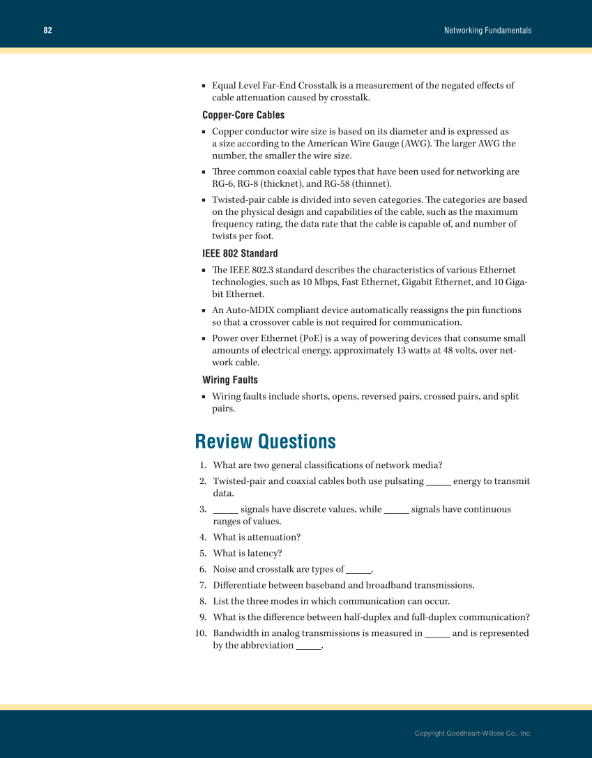 Copyright Goodheart-Willcox Co., Inc. 82 Networking Fundamentals ■ Equal Level Far-End Crosstalk is a measurement of the negated eff ects of cable attenuation caused by crosstalk. Copper-Core Cables ■ Copper conductor wire size is based on its diameter and is expressed as a size according to the American Wire Gauge (AWG). Th e larger AWG the number, the smaller the wire size. ■ Th ree common coaxial cable types that have been used for networking are RG-6, RG-8 (thicknet), and RG-58 (thinnet). ■ Twisted-pair cable is divided into seven categories. Th e categories are based on the physical design and capabilities of the cable, such as the maximum frequency rating, the data rate that the cable is capable of, and number of twists per foot. IEEE 802 Standard ■ Th e IEEE 802.3 standard describes the characteristics of various Ethernet technologies, such as 10 Mbps, Fast Ethernet, Gigabit Ethernet, and 10 Giga- bit Ethernet. ■ An Auto-MDIX compliant device automatically reassigns the pin functions so that a crossover cable is not required for communication. ■ Power over Ethernet (PoE) is a way of powering devices that consume small amounts of electrical energy, approximately 13 watts at 48 volts, over net- work cable. Wiring Faults ■ Wiring faults include shorts, opens, reversed pairs, crossed pairs, and split pairs. Review Questions 1. What are two general classifi cations of network media? 2. Twisted-pair and coaxial cables both use pulsating _____ energy to transmit data. 3. _____ signals have discrete values, while _____ signals have continuous ranges of values. 4. What is attenuation? 5. What is latency? 6. Noise and crosstalk are types of _____. 7. Diff erentiate between baseband and broadband transmissions. 8. List the three modes in which communication can occur. 9. What is the diff erence between half-duplex and full-duplex communication? 10. Bandwidth in analog transmissions is measured in _____ and is represented by the abbreviation _____.