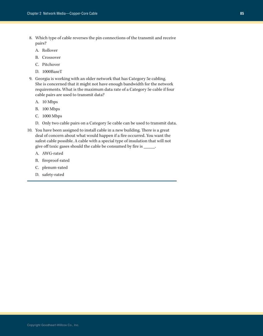 Copyright Goodheart-Willcox Co., Inc. 85 Chapter 2 Network Media—Copper-Core Cable 8. Which type of cable reverses the pin connections of the transmit and receive pairs? A. Rollover B. Crossover C. Pitchover D. 1000BaseT 9. Georgia is working with an older network that has Category 5e cabling. She is concerned that it might not have enough bandwidth for the network requirements. What is the maximum data rate of a Category 5e cable if four cable pairs are used to transmit data? A. 10 Mbps B. 100 Mbps C. 1000 Mbps D. Only two cable pairs on a Category 5e cable can be used to transmit data. 10. You have been assigned to install cable in a new building. Th ere is a great deal of concern about what would happen if a fi re occurred. You want the safest cable possible. A cable with a special type of insulation that will not give off toxic gases should the cable be consumed by fi re is _____. A. AWG-rated B. fi reproof-rated C. plenum-rated D. safety-rated