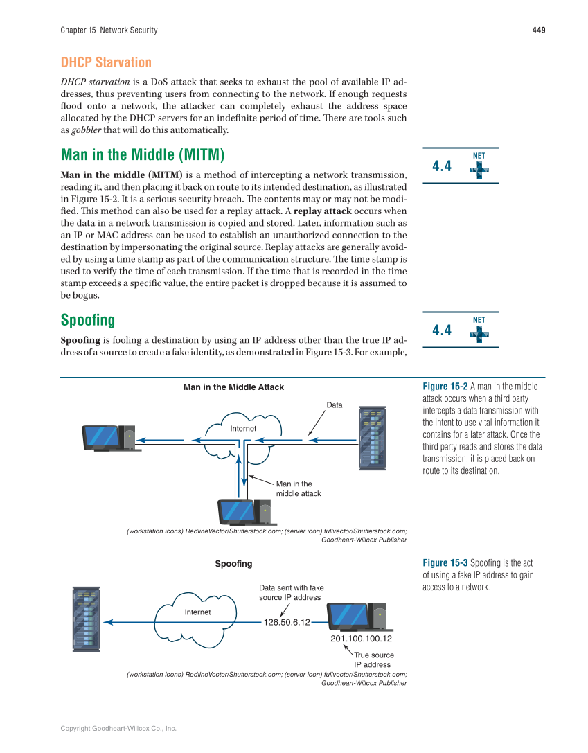 Copyright Goodheart-Willcox Co., Inc. 449 Chapter 15 Network Security DHCP Starvation DHCP starvation is a DoS attack that seeks to exhaust the pool of available IP ad- dresses, thus preventing users from connecting to the network. If enough requests fl ood onto a network, the attacker can completely exhaust the address space allocated by the DHCP servers for an indefi nite period of time. Th ere are tools such as gobbler that will do this automatically. Man in the Middle (MITM) Man in the middle (MITM) is a method of intercepting a network transmission, reading it, and then placing it back on route to its intended destination, as illustrated in Figure 15-2. It is a serious security breach. Th e contents may or may not be modi- fi ed. Th is method can also be used for a replay attack. A replay attack occurs when the data in a network transmission is copied and stored. Later, information such as an IP or MAC address can be used to establish an unauthorized connection to the destination by impersonating the original source. Replay attacks are generally avoid- ed by using a time stamp as part of the communication structure. Th e time stamp is used to verify the time of each transmission. If the time that is recorded in the time stamp exceeds a specifi c value, the entire packet is dropped because it is assumed to be bogus. Spoofi ng Spoofi ng is fooling a destination by using an IP address other than the true IP ad- dress of a source to create a fake identity, as demonstrated in Figure 15-3. For example, 4.4 NET 4.4 NET Figure 15-2 A man in the middle attack occurs when a third party intercepts a data transmission with the intent to use vital information it contains for a later attack. Once the third party reads and stores the data transmission, it is placed back on route to its destination. Data Man in the middle attack Internet Man in the Middle Attack (workstation icons) RedlineVector/Shutterstock.com (server icon) fullvector/Shutterstock.com Goodheart-Willcox Publisher 126.50.6.12 Data sent with fake source IP address True source IP address 201.100.100.12 Spoofing Internet Figure 15-3 Spoofing is the act of using a fake IP address to gain access to a network. (workstation icons) RedlineVector/Shutterstock.com (server icon) fullvector/Shutterstock.com Goodheart-Willcox Publisher
