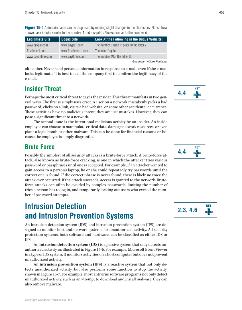 Copyright Goodheart-Willcox Co., Inc. 453 Chapter 15 Network Security altogether. Never send personal information in response to e-mail, even if the e-mail looks legitimate. It is best to call the company fi rst to confi rm the legitimacy of the e-mail. Insider Threat Perhaps the most critical threat today is the insider. Th is threat manifests in two gen- eral ways. Th e fi rst is simply user error. A user on a network mistakenly picks a bad password, clicks on a link, visits a bad website, or some other accidental occurrence. Th ese activities have no malicious intent they are just mistakes. However, they can pose a signifi cant threat to a network. Th e second issue is the intentional malicious activity by an insider. An inside employee can choose to manipulate critical data, damage network resources, or even plant a logic bomb or other malware. Th is can be done for fi nancial reasons or be- cause the employee is simply disgruntled. Brute Force Possibly the simplest of all security attacks is a brute-force attack. A brute-force at- tack, also known as brute-force cracking, is one in which the attacker tries various password or passphrases until one is accepted. For example, if an attacker wanted to gain access to a person’s laptop, he or she could repeatedly try passwords until the correct one is found. If the correct phrase is never found, there is likely no trace the attack ever occurred. If the attack succeeds, access is granted to the network. Brute- force attacks can often be avoided by complex passwords, limiting the number of tries a person has to log in, and temporarily locking out users who exceed the num- ber of password attempts. Intrusion Detection and Intrusion Prevention Systems An intrusion detection system (IDS) and intrusion prevention system (IPS) are de- signed to monitor host and network systems for unauthorized activity. All security protection systems, both software and hardware, can be classifi ed as either IDS or IPS. An intrusion detection system (IDS) is a passive system that only detects un- authorized activity, as illustrated in Figure 15-6. For example, Microsoft Event Viewer is a type of IDS system. It monitors activities on a host computer but does not prevent unauthorized activity. An intrusion prevention system (IPS) is a reactive system that not only de- tects unauthorized activity, but also performs some function to stop the activity, shown in Figure 15-7. For example, most antivirus software programs not only detect unauthorized activity, such as an attempt to download and install malware, they can also remove malware. 4.4 NET 4.4 NET 2.3, 4.6 NET Legitimate Site Bogus Site Look At the Following in the Bogus Website: www.paypal.com www.paypa1.com The number 1 used in place of the letter l. firstfederal.com www.firstfedera1.com The letter l again. www.payonline.com www.pay0nline.com The number 0 for the letter O. Figure 15-5 A domain name can be disguised by making slight changes in the characters. Notice how a lowercase l looks similar to the number 1 and a capital O looks similar to the number 0. Goodheart-Willcox Publisher