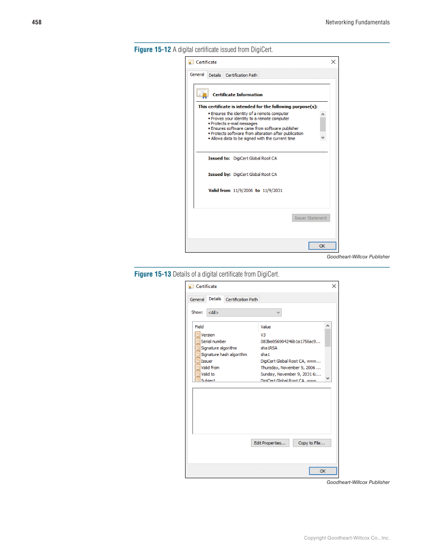 Copyright Goodheart-Willcox Co., Inc. 458 Networking Fundamentals Figure 15-12 A digital certificate issued from DigiCert. Goodheart-Willcox Publisher Figure 15-13 Details of a digital certificate from DigiCert. Goodheart-Willcox Publisher