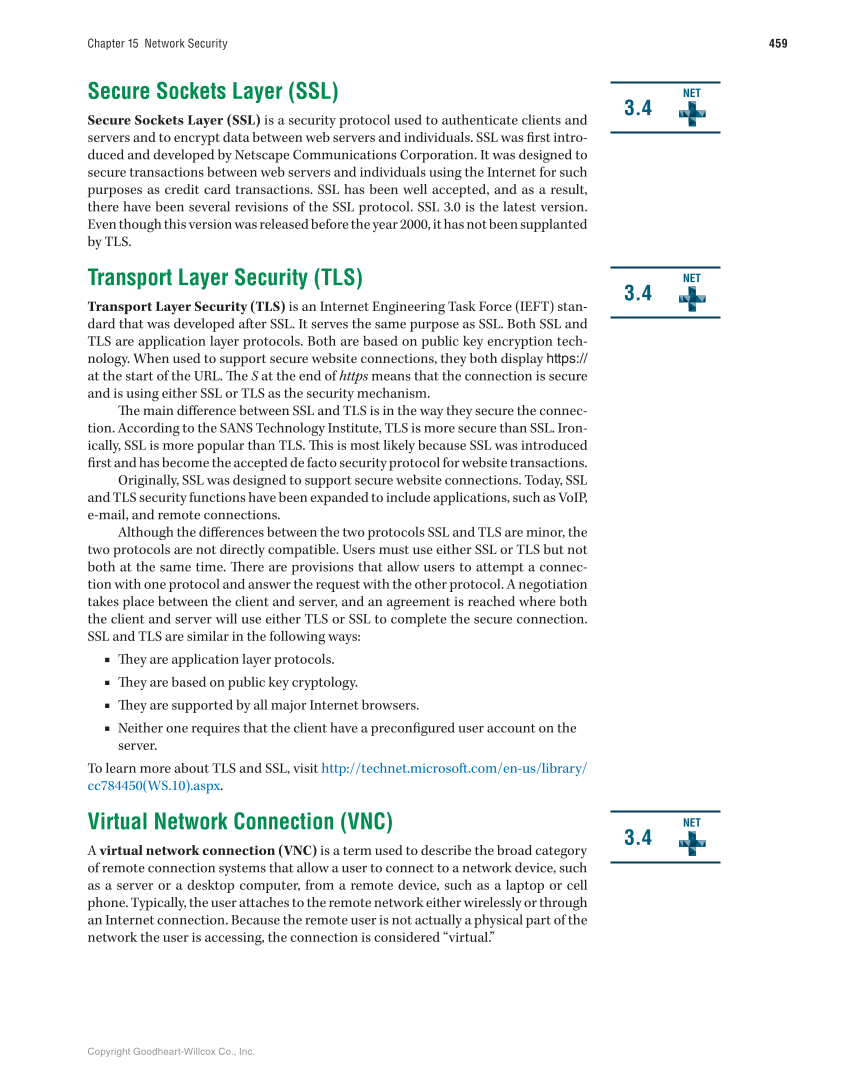 Copyright Goodheart-Willcox Co., Inc. 459 Chapter 15 Network Security Secure Sockets Layer (SSL) Secure Sockets Layer (SSL) is a security protocol used to authenticate clients and servers and to encrypt data between web servers and individuals. SSL was fi rst intro- duced and developed by Netscape Communications Corporation. It was designed to secure transactions between web servers and individuals using the Internet for such purposes as credit card transactions. SSL has been well accepted, and as a result, there have been several revisions of the SSL protocol. SSL 3.0 is the latest version. Even though this version was released before the year 2000, it has not been supplanted by TLS. Transport Layer Security (TLS) Transport Layer Security (TLS) is an Internet Engineering Task Force (IEFT) stan- dard that was developed after SSL. It serves the same purpose as SSL. Both SSL and TLS are application layer protocols. Both are based on public key encryption tech- nology. When used to support secure website connections, they both display https:// at the start of the URL. Th e S at the end of https means that the connection is secure and is using either SSL or TLS as the security mechanism. Th e main diff erence between SSL and TLS is in the way they secure the connec- tion. According to the SANS Technology Institute, TLS is more secure than SSL. Iron- ically, SSL is more popular than TLS. Th is is most likely because SSL was introduced fi rst and has become the accepted de facto security protocol for website transactions. Originally, SSL was designed to support secure website connections. Today, SSL and TLS security functions have been expanded to include applications, such as VoIP, e-mail, and remote connections. Although the diff erences between the two protocols SSL and TLS are minor, the two protocols are not directly compatible. Users must use either SSL or TLS but not both at the same time. Th ere are provisions that allow users to attempt a connec- tion with one protocol and answer the request with the other protocol. A negotiation takes place between the client and server, and an agreement is reached where both the client and server will use either TLS or SSL to complete the secure connection. SSL and TLS are similar in the following ways: ■ Th ey are application layer protocols. ■ Th ey are based on public key cryptology. ■ Th ey are supported by all major Internet browsers. ■ Neither one requires that the client have a preconfi gured user account on the server. To learn more about TLS and SSL, visit http://technet.microsoft.com/en-us/library/ cc784450(WS.10).aspx. Virtual Network Connection (VNC) A virtual network connection (VNC) is a term used to describe the broad category of remote connection systems that allow a user to connect to a network device, such as a server or a desktop computer, from a remote device, such as a laptop or cell phone. Typically, the user attaches to the remote network either wirelessly or through an Internet connection. Because the remote user is not actually a physical part of the network the user is accessing, the connection is considered “virtual.” 3.4 NET 3.4 NET 3.4 NET