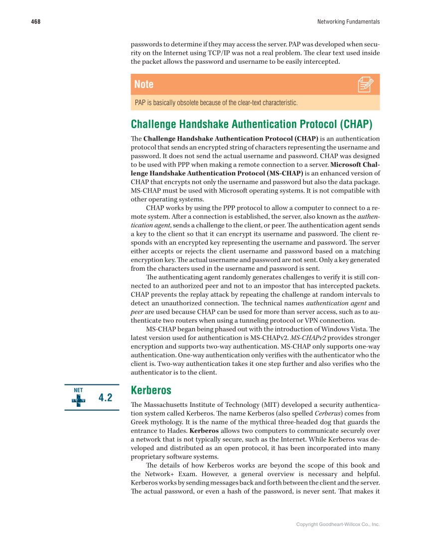 Copyright Goodheart-Willcox Co., Inc. 468 Networking Fundamentals passwords to determine if they may access the server. PAP was developed when secu- rity on the Internet using TCP/IP was not a real problem. Th e clear text used inside the packet allows the password and username to be easily intercepted. Note PAP is basically obsolete because of the clear-text characteristic. Challenge Handshake Authentication Protocol (CHAP) Th e Challenge Handshake Authentication Protocol (CHAP) is an authentication protocol that sends an encrypted string of characters representing the username and password. It does not send the actual username and password. CHAP was designed to be used with PPP when making a remote connection to a server. Microsoft Chal- lenge Handshake Authentication Protocol (MS-CHAP) is an enhanced version of CHAP that encrypts not only the username and password but also the data package. MS-CHAP must be used with Microsoft operating systems. It is not compatible with other operating systems. CHAP works by using the PPP protocol to allow a computer to connect to a re- mote system. After a connection is established, the server, also known as the authen- tication agent, sends a challenge to the client, or peer. Th e authentication agent sends a key to the client so that it can encrypt its username and password. Th e client re- sponds with an encrypted key representing the username and password. Th e server either accepts or rejects the client username and password based on a matching encryption key. Th e actual username and password are not sent. Only a key generated from the characters used in the username and password is sent. Th e authenticating agent randomly generates challenges to verify it is still con- nected to an authorized peer and not to an impostor that has intercepted packets. CHAP prevents the replay attack by repeating the challenge at random intervals to detect an unauthorized connection. Th e technical names authentication agent and peer are used because CHAP can be used for more than server access, such as to au- thenticate two routers when using a tunneling protocol or VPN connection. MS-CHAP began being phased out with the introduction of Windows Vista. Th e latest version used for authentication is MS-CHAPv2. MS-CHAPv2 provides stronger encryption and supports two-way authentication. MS-CHAP only supports one-way authentication. One-way authentication only verifi es with the authenticator who the client is. Two-way authentication takes it one step further and also verifi es who the authenticator is to the client. Kerberos Th e Massachusetts Institute of Technology (MIT) developed a security authentica- tion system called Kerberos. Th e name Kerberos (also spelled Cerberus) comes from Greek mythology. It is the name of the mythical three-headed dog that guards the entrance to Hades. Kerberos allows two computers to communicate securely over a network that is not typically secure, such as the Internet. While Kerberos was de- veloped and distributed as an open protocol, it has been incorporated into many proprietary software systems. Th e details of how Kerberos works are beyond the scope of this book and the Network+ Exam. However, a general overview is necessary and helpful . Kerberos works by sending messages back and forth between the client and the server. Th e actual password, or even a hash of the password, is never sent. Th at makes it 4.2 NET