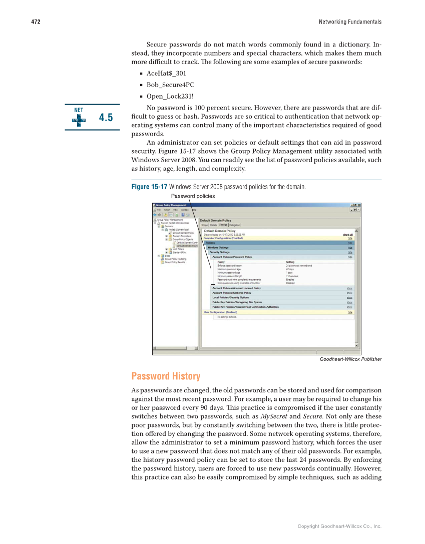 Copyright Goodheart-Willcox Co., Inc. 472 Networking Fundamentals Secure passwords do not match words commonly found in a dictionary. In- stead, they incorporate numbers and special characters, which makes them much more diffi cult to crack. Th e following are some examples of secure passwords: ■ AceHat$_301 ■ Bob_$ecure4PC ■ Open_Lock231! No password is 100 percent secure. However, there are passwords that are dif- fi cult to guess or hash. Passwords are so critical to authentication that network op- erating systems can control many of the important characteristics required of good passwords. An administrator can set policies or default settings that can aid in password security. Figure 15-17 shows the Group Policy Management utility associated with Windows Server 2008. You can readily see the list of password policies available, such as history, age, length, and complexity. 4.5 NET Figure 15-17 Windows Server 2008 password policies for the domain. Password policies Goodheart-Willcox Publisher Password History As passwords are changed, the old passwords can be stored and used for comparison against the most recent password. For example, a user may be required to change his or her password every 90 days. Th is practice is compromised if the user constantly switches between two passwords, such as MySecret and Secure. Not only are these poor passwords, but by constantly switching between the two, there is little protec- tion off ered by changing the password. Some network operating systems, therefore, allow the administrator to set a minimum password history, which forces the user to use a new password that does not match any of their old passwords. For example, the history password policy can be set to store the last 24 passwords. By enforcing the password history, users are forced to use new passwords continually. However, this practice can also be easily compromised by simple techniques, such as adding