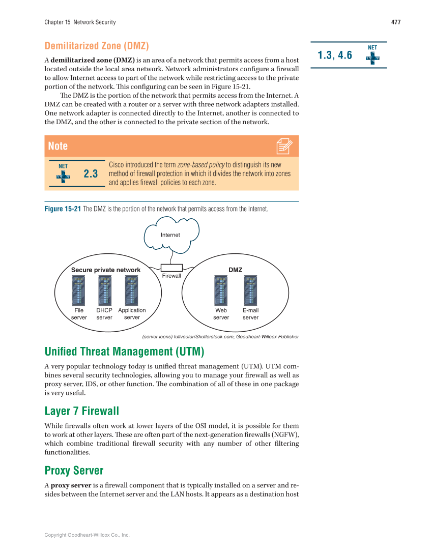 Copyright Goodheart-Willcox Co., Inc. 477 Chapter 15 Network Security Demilitarized Zone (DMZ) A demilitarized zone (DMZ) is an area of a network that permits access from a host located outside the local area network. Network administrators confi gure a fi rewall to allow Internet access to part of the network while restricting access to the private portion of the network. Th is confi guring can be seen in Figure 15-21. Th e DMZ is the portion of the network that permits access from the Internet. A DMZ can be created with a router or a server with three network adapters installed. One network adapter is connected directly to the Internet, another is connected to the DMZ, and the other is connected to the private section of the network. 1.3, 4.6 NET Figure 15-21 The DMZ is the portion of the network that permits access from the Internet. File server Application server Firewall DHCP server Web server E-mail server Internet Secure private network DMZ (server icons) fullvector/Shutterstock.com Goodheart-Willcox Publisher Note Cisco introduced the term zone-based policy to distinguish its new method of firewall protection in which it divides the network into zones and applies firewall policies to each zone. 2.3 NET Unifi ed Threat Management (UTM) A very popular technology today is unifi ed threat management (UTM). UTM com- bines several security technologies, allowing you to manage your fi rewall as well as proxy server, IDS, or other function. Th e combination of all of these in one package is very useful. Layer 7 Firewall While fi rewalls often work at lower layers of the OSI model, it is possible for them to work at other layers. Th ese are often part of the next-generation fi rewalls (NGFW), which combine traditional fi rewall security with any number of other fi ltering functionalities. Proxy Server A proxy server is a fi rewall component that is typically installed on a server and re- sides between the Internet server and the LAN hosts. It appears as a destination host