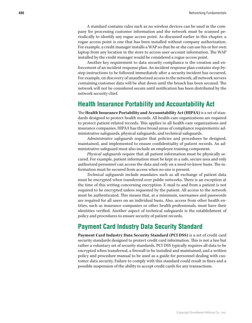 Copyright Goodheart-Willcox Co., Inc. 486 Networking Fundamentals A standard contains rules such as no wireless devices can be used in the com- pany for processing customer information and the network must be scanned pe- riodically to identify any rogue access point. As discussed earlier in this chapter, a rogue access point is one that has been installed without company authorization. For example, a credit manager installs a WAP so that he or she can use his or her own laptop from any location in the store to access user-account information. Th e WAP installed by the credit manager would be considered a rogue access point. Another key requirement to data security compliance is the creation and en- forcement of an incident response plan. An incident response plan contains step-by- step instructions to be followed immediately after a security incident has occurred. For example, on discovery of unauthorized access to the network, all network servers containing customer data will be shut down until the breach has been secured. Th e network will not be considered secure until notifi cation has been distributed by the network security chief. Health Insurance Portability and Accountability Act Th e Health Insurance Portability and Accountability Act (HIPAA) is a set of stan- dards designed to protect health records. All health-care organizations are required to protect patient-related records. Th is applies to all health-care organizations and insurance companies. HIPAA has three broad areas of compliance requirements: ad- ministrative safeguards, physical safeguards, and technical safeguards. Administrative safeguards require that policies and procedures be designed, maintained, and implemented to ensure confi dentiality of patient records. An ad- ministrative safeguard must also include an employee training component. Physical safeguards require that all patient information must be physically se- cured. For example, patient information must be kept in a safe, secure area and only authorized personnel can access the data and only on a need-to-know basis. Th e in- formation must be secured from access when no one is present. Technical safeguards include mandates such as all exchange of patient data must be encrypted when transferred over public networks. Th ere is an exception at the time of this writing concerning encryption. E-mail to and from a patient is not required to be encrypted unless requested by the patient. All access to the network must be authenticated. Th is means that, at a minimum, usernames and passwords are required for all users on an individual basis. Also, access from other health en- tities, such as insurance companies or other health professionals, must have their identities verifi ed. Another aspect of technical safeguards is the establishment of policy and procedures to ensure security of patient records. Payment Card Industry Data Security Standard Payment Card Industry Data Security Standard (PCI DSS) is a set of credit card security standards designed to protect credit card information. Th is is not a law but rather a voluntary set of security standards. PCI DSS typically requires all data to be encrypted when transferred, a fi rewall to be installed and maintained, and a written policy and procedure manual to be used as a guide for personnel dealing with cus- tomer data security. Failure to comply with this standard could result in fi nes and a possible suspension of the ability to accept credit cards for any transactions.