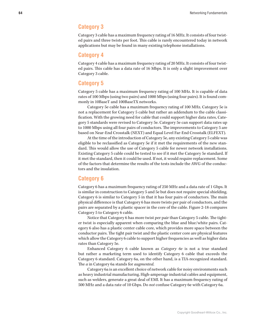 Copyright Goodheart-Willcox Co., Inc. 64 Networking Fundamentals Category 3 Category 3 cable has a maximum frequency rating of 16 MHz. It consists of four twist- ed pairs and three twists per foot. Th is cable is rarely encountered today in network applications but may be found in many existing telephone installations. Category 4 Category 4 cable has a maximum frequency rating of 20 MHz. It consists of four twist- ed pairs. Th is cable has a data rate of 16 Mbps. It is only a slight improvement over Category 3 cable. Category 5 Category 5 cable has a maximum frequency rating of 100 MHz. It is capable of data rates of 100 Mbps (using two pairs) and 1000 Mbps (using four pairs). It is found com- monly in 10BaseT and 100BaseTX networks. Category 5e cable has a maximum frequency rating of 100 MHz. Category 5e is not a replacement for Category 5 cable but rather an addendum to the cable classi- fi cation. With the growing need for cable that could support higher data rates, Cate- gory 5 standards were revised to Category 5e. Category 5e can support data rates up to 1000 Mbps using all four pairs of conductors. Th e improvements to Category 5 are based on Near-End Crosstalk (NEXT) and Equal Level Far-End Crosstalk (ELFEXT). At the time of the introduction of Category 5e, any existing Category 5 cable was eligible to be reclassifi ed as Category 5e if it met the requirements of the new stan- dard. Th is would allow the use of Category 5 cable for newer network installations. Existing Category 5 cable could be tested to see if it met the Category 5e standard. If it met the standard, then it could be used. If not, it would require replacement. Some of the factors that determine the results of the tests include the AWG of the conduc- tors and the insulation. Category 6 Category 6 has a maximum frequency rating of 250 MHz and a data rate of 1 Gbps. It is similar in construction to Category 5 and 5e but does not require special shielding. Category 6 is similar to Category 5 in that it has four pairs of conductors. Th e main physical diff erence is that Category 6 has more twists per pair of conductors, and the pairs are separated by a plastic spacer in the core of the cable. Figure 2-18 compares Category 5 to Category 6 cable. Notice that Category 6 has more twist per pair than Category 5 cable. Th e tight- er twist is especially apparent when comparing the blue and blue/white pairs. Cat- egory 6 also has a plastic center cable core, which provides more space between the conductor pairs. Th e tight pair twist and the plastic center core are physical features which allow the Category 6 cable to support higher frequencies as well as higher data rates than Category 5e. Enhanced Category 6 cable known as Category 6e is not a true standard but rather a marketing term used to identify Category 6 cable that exceeds the Category 6 standard. Category 6a, on the other hand, is a TIA-recognized standard. Th e a in Category 6a stands for augmented. Category 6a is an excellent choice of network cable for noisy environments such as heavy industrial manufacturing. High-amperage industrial cables and equipment, such as welders, generate a great deal of EMI. It has a maximum frequency rating of 500 MHz and a data rate of 10 Gbps. Do not confuse Category 6e with Category 6a.
