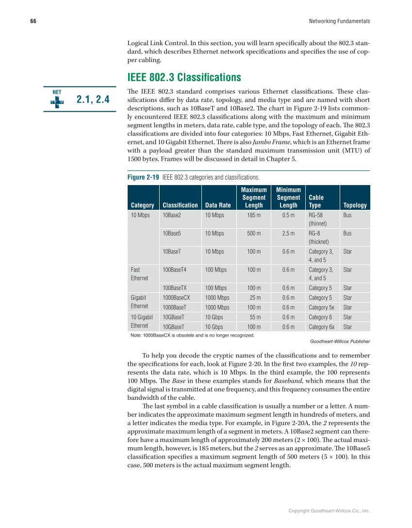 Copyright Goodheart-Willcox Co., Inc. 66 Networking Fundamentals Logical Link Control. In this section, you will learn specifi cally about the 802.3 stan- dard, which describes Ethernet network specifi cations and specifi es the use of cop- per cabling. IEEE 802.3 Classifi cations Th e IEEE 802.3 standard comprises various Ethernet classifi cations. Th ese clas- sifi cations diff er by data rate, topology, and media type and are named with short descriptions, such as 10BaseT and 10Base2. Th e chart in Figure 2-19 lists common- ly encountered IEEE 802.3 classifi cations along with the maximum and minimum segment lengths in meters, data rate, cable type, and the topology of each. Th e 802.3 classifi cations are divided into four categories: 10 Mbps, Fast Ethernet, Gigabit Eth- ernet, and 10 Gigabit Ethernet. Th ere is also Jumbo Frame, which is an Ethernet frame with a payload greater than the standard maximum transmission unit (MTU) of 1500 bytes. Frames will be discussed in detail in Chapter 5. 2.1, 2.4 NET Goodheart-Willcox Publisher Note: 1000BaseCX is obsolete and is no longer recognized. Figure 2-19 IEEE 802.3 categories and classifications. Category Classifi cation Data Rate Maximum Segment Length Minimum Segment Length Cable Type Topology 10 Mbps 10Base2 10 Mbps 185 m 0.5 m RG-58 (thinnet) Bus 10Base5 10 Mbps 500 m 2.5 m RG-8 (thicknet) Bus 10BaseT 10 Mbps 100 m 0.6 m Category 3, 4, and 5 Star Fast Ethernet 100BaseT4 100 Mbps 100 m 0.6 m Category 3, 4, and 5 Star 100BaseTX 100 Mbps 100 m 0.6 m Category 5 Star Gigabit Ethernet 1000BaseCX 1000 Mbps 25 m 0.6 m Category 5 Star 1000BaseT 1000 Mbps 100 m 0.6 m Category 5e Star 10 Gigabit Ethernet 10GBaseT 10 Gbps 55 m 0.6 m Category 6 Star 10GBaseT 10 Gbps 100 m 0.6 m Category 6a Star To help you decode the cryptic names of the classifi cations and to remember the specifi cations for each, look at Figure 2-20. In the fi rst two examples, the 10 rep- resents the data rate, which is 10 Mbps. In the third example, the 100 represents 100 Mbps. Th e Base in these examples stands for Baseband, which means that the digital signal is transmitted at one frequency, and this frequency consumes the entire bandwidth of the cable. Th e last symbol in a cable classifi cation is usually a number or a letter. A num- ber indicates the approximate maximum segment length in hundreds of meters, and a letter indicates the media type. For example, in Figure 2-20A, the 2 represents the approximate maximum length of a segment in meters. A 10Base2 segment can there- fore have a maximum length of approximately 200 meters (2 × 100). Th e actual maxi- mum length, however, is 185 meters, but the 2 serves as an approximate. Th e 10Base5 classifi cation specifi es a maximum segment length of 500 meters (5 × 100). In this case, 500 meters is the actual maximum segment length.