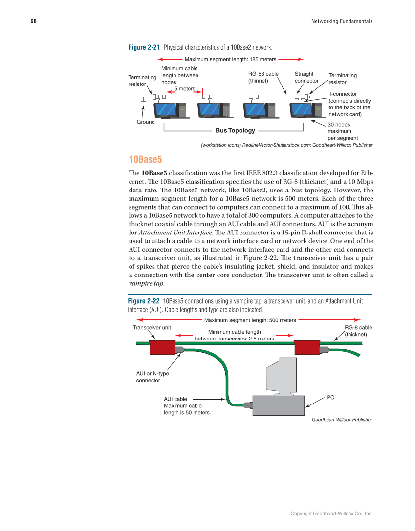 Copyright Goodheart-Willcox Co., Inc. 68 Networking Fundamentals T-connector (connects directly to the back of the network card) 30 nodes maximum per segment Terminating resistor Straight connector Terminating resistor .5 meters Minimum cable length between nodes Ground Bus Topology RG-58 cable (thinnet) Maximum segment length: 185 meters (workstation icons) RedlineVector/Shutterstock.com Goodheart-Willcox Publisher Figure 2-21 Physical characteristics of a 10Base2 network. 10Base5 Th e 10Base5 classifi cation was the fi rst IEEE 802.3 classifi cation developed for Eth- ernet. Th e 10Base5 classifi cation specifi es the use of RG-8 (thicknet) and a 10 Mbps data rate. Th e 10Base5 network, like 10Base2, uses a bus topology. However, the maximum segment length for a 10Base5 network is 500 meters. Each of the three segments that can connect to computers can connect to a maximum of 100. Th is al- lows a 10Base5 network to have a total of 300 computers. A computer attaches to the thicknet coaxial cable through an AUI cable and AUI connectors. AUI is the acronym for Attachment Unit Interface. Th e AUI connector is a 15-pin D-shell connector that is used to attach a cable to a network interface card or network device. One end of the AUI connector connects to the network interface card and the other end connects to a transceiver unit, as illustrated in Figure 2-22. Th e transceiver unit has a pair of spikes that pierce the cable’s insulating jacket, shield, and insulator and makes a connection with the center core conductor. Th e transceiver unit is often called a vampire tap. Maximum segment length: 500 meters Transceiver unit AUI or N-type connector PC RG-8 cable (thicknet) AUI cable Maximum cable length is 50 meters Minimum cable length between transceivers: 2.5 meters Figure 2-22 10Base5 connections using a vampire tap, a transceiver unit, and an Attachment Unit Interface (AUI). Cable lengths and type are also indicated. Goodheart-Willcox Publisher