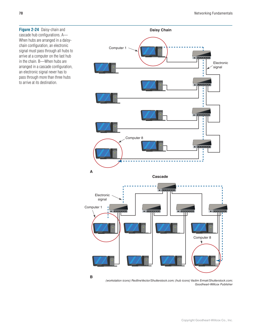 Copyright Goodheart-Willcox Co., Inc. 70 Networking Fundamentals Computer 1 Electronic signal Computer 8 A B Computer 8 Computer 1 Electronic signal Daisy Chain Cascade Figure 2-24 Daisy-chain and cascade hub configurations. A— When hubs are arranged in a daisy- chain configuration, an electronic signal must pass through all hubs to arrive at a computer on the last hub in the chain. B—When hubs are arranged in a cascade configuration, an electronic signal never has to pass through more than three hubs to arrive at its destination. (workstation icons) RedlineVector/Shutterstock.com (hub icons) Vadim Ermak/Shutterstock.com Goodheart-Willcox Publisher