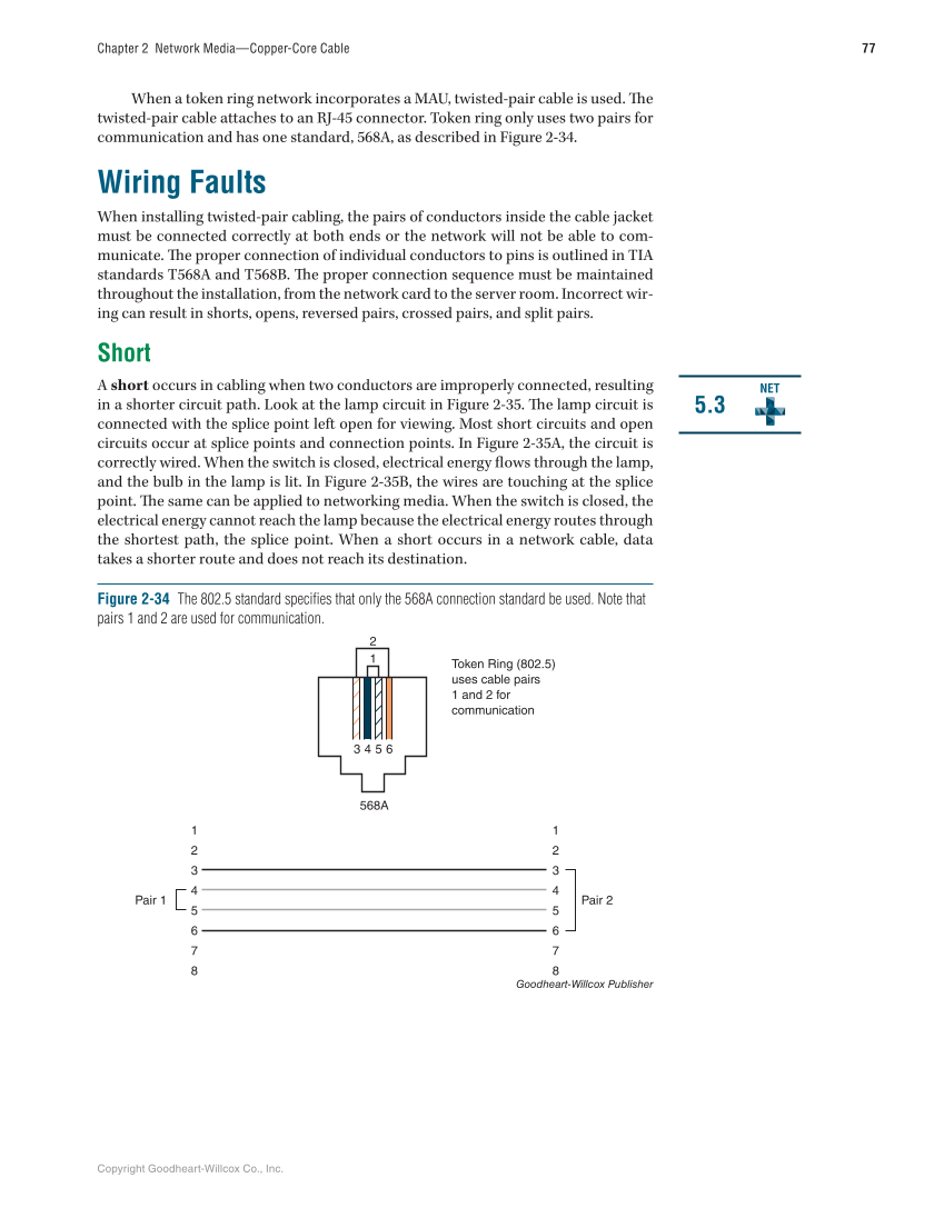 Copyright Goodheart-Willcox Co., Inc. 77 Chapter 2 Network Media—Copper-Core Cable When a token ring network incorporates a MAU, twisted-pair cable is used. Th e twisted-pair cable attaches to an RJ-45 connector. Token ring only uses two pairs for communication and has one standard, 568A, as described in Figure 2-34. Wiring Faults When installing twisted-pair cabling, the pairs of conductors inside the cable jacket must be connected correctly at both ends or the network will not be able to com- municate. Th e proper connection of individual conductors to pins is outlined in TIA standards T568A and T568B. Th e proper connection sequence must be maintained throughout the installation, from the network card to the server room. Incorrect wir- ing can result in shorts, opens, reversed pairs, crossed pairs, and split pairs. Short A short occurs in cabling when two conductors are improperly connected, resulting in a shorter circuit path. Look at the lamp circuit in Figure 2-35. Th e lamp circuit is connected with the splice point left open for viewing. Most short circuits and open circuits occur at splice points and connection points. In Figure 2-35A, the circuit is correctly wired. When the switch is closed, electrical energy fl ows through the lamp, and the bulb in the lamp is lit. In Figure 2-35B, the wires are touching at the splice point. Th e same can be applied to networking media. When the switch is closed, the electrical energy cannot reach the lamp because the electrical energy routes through the shortest path, the splice point. When a short occurs in a network cable, data takes a shorter route and does not reach its destination. 5.3 NET 1 2 Token Ring (802.5) uses cable pairs 1 and 2 for communication 4 3 6 5 568A Pair 1 Pair 2 1 2 3 4 5 6 7 8 1 2 3 4 5 6 7 8 Figure 2-34 The 802.5 standard specifies that only the 568A connection standard be used. Note that pairs 1 and 2 are used for communication. Goodheart-Willcox Publisher