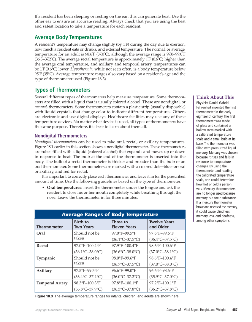 Copyright Goodheart-Willcox Co., Inc. Chapter 18 Vital Signs, Height, and Weight 457 If a resident has been sleeping or resting on the ear, this can generate heat. Use the other ear to ensure an accurate reading. Always check that you are using the best and safest location to take a temperature for each resident. Average Body Temperatures A resident’s temperature may change slightly (by 1°F) during the day due to exertion, how much a resident eats or drinks, and external temperature. The normal, or average, temperature for an adult is 98.6°F (37.0°C), although the average range is 97.0–99.0°F (36.5–37.2°C). The average rectal temperature is approximately 1°F (0.6°C) higher than the average oral temperature, and axillary and temporal artery temperatures can be 1°F (0.6°C) lower. Hypothermia, while not seen often, is a body temperature below 95°F (35°C). Average temperature ranges also vary based on a resident’s age and the type of thermometer used (Figure 18.3). Types of Thermometers Several different types of thermometers help measure temperature. Some thermom- eters are filled with a liquid that is usually colored alcohol. These are nondigital, or manual, thermometers. Some thermometers contain a plastic strip (usually disposable) with liquid crystals that change color to indicate different temperatures. Others are electronic and use digital displays. Healthcare facilities may use any of these temperature devices. No matter what device is used, all types of thermometers have the same purpose. Therefore, it is best to learn about them all. Nondigital Thermometers Nondigital thermometers can be used to take oral, rectal, or axillary temperatures. Figure 18.1 earlier in this section shows a nondigital thermometer. These thermometers are tubes filled with a liquid (colored alcohol) that expands and moves up or down in response to heat. The bulb at the end of the thermometer is inserted into the body. The bulb of a rectal thermometer is thicker and broader than the bulb of an oral thermometer. Some thermometers are marked with a colored dot—blue for oral or axillary, and red for rectal. It is important to correctly place each thermometer and leave it in for the prescribed amount of time. Use the following guidelines based on the type of thermometer: • Oral temperatures: insert the thermometer under the tongue and ask the resident to close his or her mouth completely while breathing through the nose. Leave the thermometer in for three minutes. Think About This Physicist Daniel Gabriel Fahrenheit invented the first thermometer in the early eighteenth century. The first thermometer was made of glass and contained a hollow stem marked with a calibrated temperature scale and a small bulb at its base. The thermometer was filled with pressurized liquid mercury. Mercury was chosen because it rises and falls in response to temperature changes. By using the thermometer and reading the calibrated temperature scale, one could determine how hot or cold a person was. Mercury thermometers are no longer used because mercury is a toxic substance. If a mercury thermometer broke and released the mercury, it could cause blindness, memory loss, and deafness, among other symptoms. Average Ranges of Body Temperature Thermometer Birth to Two Years Three to Eleven Years Twelve Years and Older Oral Should not be taken 97.0°F–99.5°F (36.1°C–37.5°C) 97.6°F–99.6°F (36.4°C–37.5°C) Rectal 97.0°F–100.4°F (36.1°C–38.0°C) 97.9°F–100.4°F (36.6°C–38.0°C) 98.6°F–100.6°F (37.0°C–38.1°C) Tympanic Should not be taken 98.0°F–99.6°F (36.7°C–37.5°C) 98.6°F–100.4°F (37.0°C–38.0°C) Axillary 97.5°F–99.3°F (36.4°C–37.4°C) 96.6°F–99.0°F (36.0°C–37.2°C) 96.6°F–98.6°F (35.9°C–37.0°C) Temporal Artery 98.3°F–100.3°F (36.8°C–37.9°C) 97.8°F–100.1°F (36.5°C–37.8°C) 97.2°F–100.1°F (36.2°C–37.8°C) Figure 18.3 The average temperature ranges for infants, children, and adults are shown here.