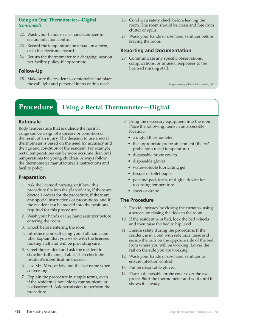 460 The Nursing Assistant Copyright Goodheart-Willcox Co., Inc. Using an Oral Thermometer—Digital (continued) 22. Wash your hands or use hand sanitizer to ensure infection control. 23. Record the temperature on a pad, on a form, or in the electronic record. 24. Return the thermometer to a charging location per facility policy, if appropriate. Follow-Up 25. Make sure the resident is comfortable and place the call light and personal items within reach. 26. Conduct a safety check before leaving the room. The room should be clean and free from clutter or spills. 27. Wash your hands or use hand sanitizer before leaving the room. Reporting and Documentation 28. Communicate any specific observations, complications, or unusual responses to the licensed nursing staff. Images courtesy of Wards Forest Media, LLC Rationale Body temperature that is outside the normal range can be a sign of a disease or condition or the result of an injury. The decision to use a rectal thermometer is based on the need for accuracy and the age and condition of the resident. For example, rectal temperatures can be more accurate than oral temperatures for young children. Always follow the thermometer manufacturer’s instructions and facility policy. Preparation 1. Ask the licensed nursing staff how this procedure fits into the plan of care, if there are doctor’s orders for the procedure, if there are any special instructions or precautions, and if the resident can be moved into the positions required for this procedure. 2. Wash your hands or use hand sanitizer before entering the room. 3. Knock before entering the room. 4. Introduce yourself using your full name and title. Explain that you work with the licensed nursing staff and will be providing care. 5. Greet the resident and ask the resident to state her full name, if able. Then check the resident’s identification bracelet. 6. Use Mr., Mrs., or Ms. and the last name when conversing. 7. Explain the procedure in simple terms, even if the resident is not able to communicate or is disoriented. Ask permission to perform the procedure. 8. Bring the necessary equipment into the room. Place the following items in an accessible location: • a digital thermometer • the appropriate probe attachment (the red probe for a rectal temperature) • disposable probe covers • disposable gloves • water-soluble lubricating gel • tissues or toilet paper • pen and pad, form, or digital device for recording temperature • sheet or drape The Procedure 9. Provide privacy by closing the curtains, using a screen, or closing the door to the room. 10. If the resident is in bed, lock the bed wheels and then raise the bed to hip level. 11. Ensure safety during the procedure. If the resident is in a bed with side rails, raise and secure the rails on the opposite side of the bed from where you will be working. Lower the rail on the side you are working. 12. Wash your hands or use hand sanitizer to ensure infection control. 13. Put on disposable gloves. 14. Place a disposable probe cover over the red probe. Start the thermometer and wait until it shows it is ready. Using a Rectal Thermometer—Digital Procedure