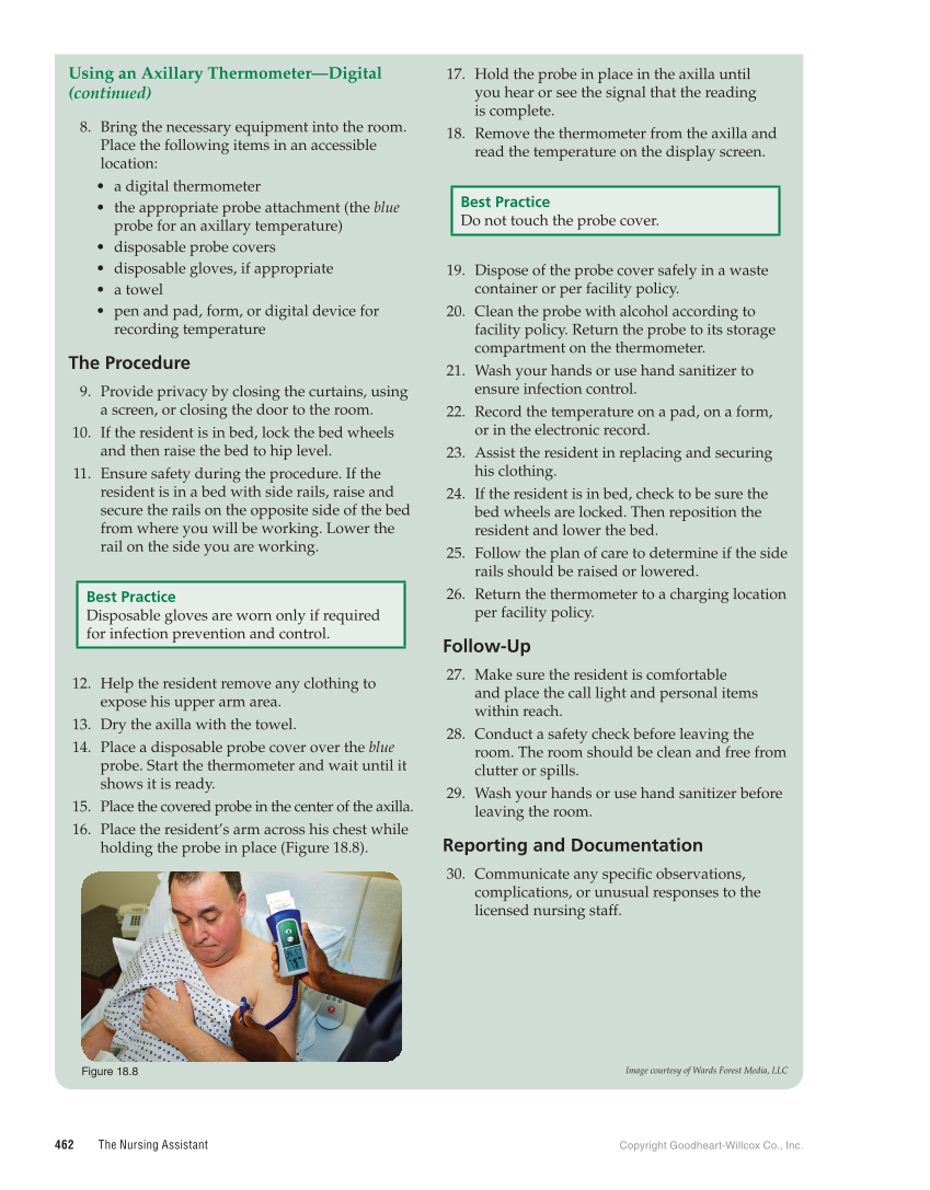 462 The Nursing Assistant Copyright Goodheart-Willcox Co., Inc. Using an Axillary Thermometer—Digital (continued) 8. Bring the necessary equipment into the room. Place the following items in an accessible location: • a digital thermometer • the appropriate probe attachment (the blue probe for an axillary temperature) • disposable probe covers • disposable gloves, if appropriate • a towel • pen and pad, form, or digital device for recording temperature The Procedure 9. Provide privacy by closing the curtains, using a screen, or closing the door to the room. 10. If the resident is in bed, lock the bed wheels and then raise the bed to hip level. 11. Ensure safety during the procedure. If the resident is in a bed with side rails, raise and secure the rails on the opposite side of the bed from where you will be working. Lower the rail on the side you are working. Best Practice Disposable gloves are worn only if required for infection prevention and control. 12. Help the resident remove any clothing to expose his upper arm area. 13. Dry the axilla with the towel. 14. Place a disposable probe cover over the blue probe. Start the thermometer and wait until it shows it is ready. 15. Place the covered probe in the center of the axilla. 16. Place the resident’s arm across his chest while holding the probe in place (Figure 18.8). Figure 18.8 17. Hold the probe in place in the axilla until you hear or see the signal that the reading is complete. 18. Remove the thermometer from the axilla and read the temperature on the display screen. Best Practice Do not touch the probe cover. 19. Dispose of the probe cover safely in a waste container or per facility policy. 20. Clean the probe with alcohol according to facility policy. Return the probe to its storage compartment on the thermometer. 21. Wash your hands or use hand sanitizer to ensure infection control. 22. Record the temperature on a pad, on a form, or in the electronic record. 23. Assist the resident in replacing and securing his clothing. 24. If the resident is in bed, check to be sure the bed wheels are locked. Then reposition the resident and lower the bed. 25. Follow the plan of care to determine if the side rails should be raised or lowered. 26. Return the thermometer to a charging location per facility policy. Follow-Up 27. Make sure the resident is comfortable and place the call light and personal items within reach. 28. Conduct a safety check before leaving the room. The room should be clean and free from clutter or spills. 29. Wash your hands or use hand sanitizer before leaving the room. Reporting and Documentation 30. Communicate any specific observations, complications, or unusual responses to the licensed nursing staff. Image courtesy of Wards Forest Media, LLC