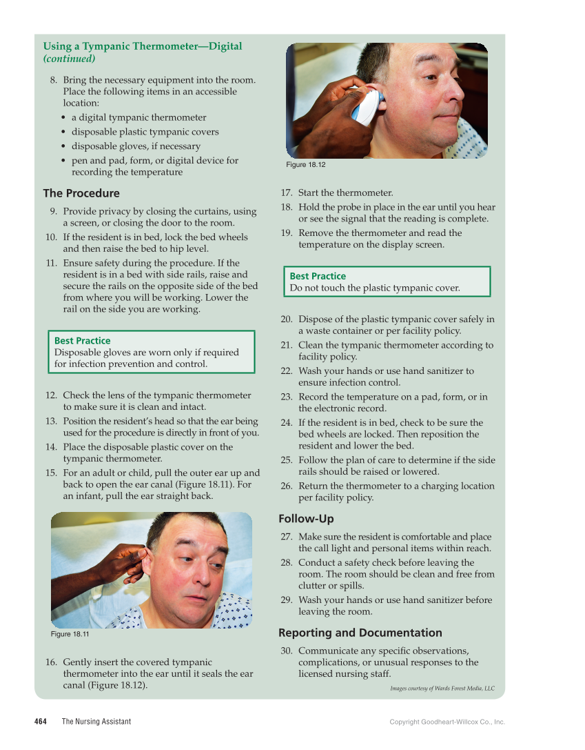 464 The Nursing Assistant Copyright Goodheart-Willcox Co., Inc. Using a Tympanic Thermometer—Digital (continued) 8. Bring the necessary equipment into the room. Place the following items in an accessible location: • a digital tympanic thermometer • disposable plastic tympanic covers • disposable gloves, if necessary • pen and pad, form, or digital device for recording the temperature The Procedure 9. Provide privacy by closing the curtains, using a screen, or closing the door to the room. 10. If the resident is in bed, lock the bed wheels and then raise the bed to hip level. 11. Ensure safety during the procedure. If the resident is in a bed with side rails, raise and secure the rails on the opposite side of the bed from where you will be working. Lower the rail on the side you are working. Best Practice Disposable gloves are worn only if required for infection prevention and control. 12. Check the lens of the tympanic thermometer to make sure it is clean and intact. 13. Position the resident’s head so that the ear being used for the procedure is directly in front of you. 14. Place the disposable plastic cover on the tympanic thermometer. 15. For an adult or child, pull the outer ear up and back to open the ear canal (Figure 18.11). For an infant, pull the ear straight back. Figure 18.11 16. Gently insert the covered tympanic thermometer into the ear until it seals the ear canal (Figure 18.12). Figure 18.12 17. Start the thermometer. 18. Hold the probe in place in the ear until you hear or see the signal that the reading is complete. 19. Remove the thermometer and read the temperature on the display screen. Best Practice Do not touch the plastic tympanic cover. 20. Dispose of the plastic tympanic cover safely in a waste container or per facility policy. 21. Clean the tympanic thermometer according to facility policy. 22. Wash your hands or use hand sanitizer to ensure infection control. 23. Record the temperature on a pad, form, or in the electronic record. 24. If the resident is in bed, check to be sure the bed wheels are locked. Then reposition the resident and lower the bed. 25. Follow the plan of care to determine if the side rails should be raised or lowered. 26. Return the thermometer to a charging location per facility policy. Follow-Up 27. Make sure the resident is comfortable and place the call light and personal items within reach. 28. Conduct a safety check before leaving the room. The room should be clean and free from clutter or spills. 29. Wash your hands or use hand sanitizer before leaving the room. Reporting and Documentation 30. Communicate any specific observations, complications, or unusual responses to the licensed nursing staff. Images courtesy of Wards Forest Media, LLC