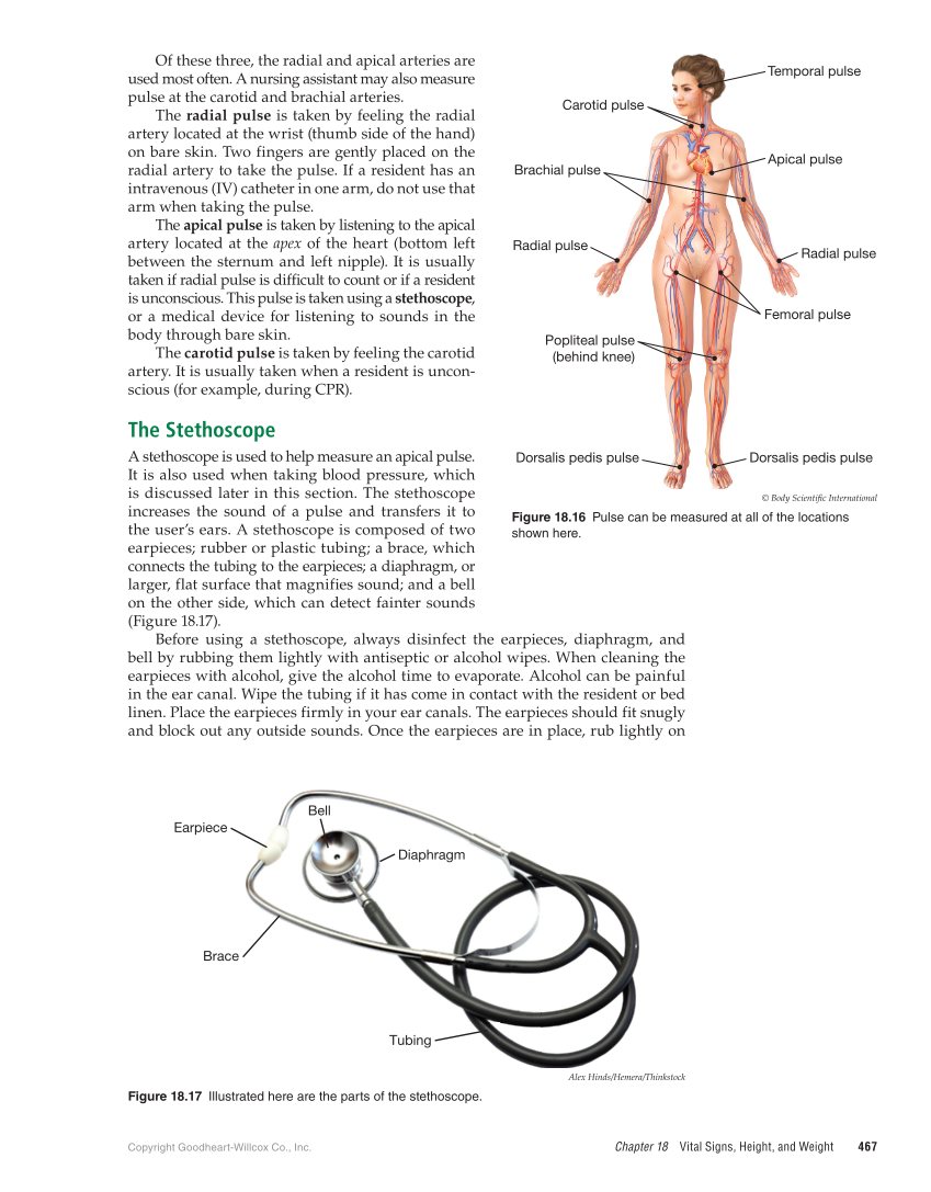 Copyright Goodheart-Willcox Co., Inc. Chapter 18 Vital Signs, Height, and Weight 467 Of these three, the radial and apical arteries are used most often. A nursing assistant may also measure pulse at the carotid and brachial arteries. The radial pulse is taken by feeling the radial artery located at the wrist (thumb side of the hand) on bare skin. Two fingers are gently placed on the radial artery to take the pulse. If a resident has an intravenous (IV) catheter in one arm, do not use that arm when taking the pulse. The apical pulse is taken by listening to the apical artery located at the apex of the heart (bottom left between the sternum and left nipple). It is usually taken if radial pulse is difficult to count or if a resident is unconscious. This pulse is taken using a stethoscope, or a medical device for listening to sounds in the body through bare skin. The carotid pulse is taken by feeling the carotid artery. It is usually taken when a resident is uncon- scious (for example, during CPR). The Stethoscope A stethoscope is used to help measure an apical pulse. It is also used when taking blood pressure, which is discussed later in this section. The stethoscope increases the sound of a pulse and transfers it to the user’s ears. A stethoscope is composed of two earpieces rubber or plastic tubing a brace, which connects the tubing to the earpieces a diaphragm, or larger, flat surface that magnifies sound and a bell on the other side, which can detect fainter sounds (Figure 18.17). Before using a stethoscope, always disinfect the earpieces, diaphragm, and bell by rubbing them lightly with antiseptic or alcohol wipes. When cleaning the earpieces with alcohol, give the alcohol time to evaporate. Alcohol can be painful in the ear canal. Wipe the tubing if it has come in contact with the resident or bed linen. Place the earpieces firmly in your ear canals. The earpieces should fit snugly and block out any outside sounds. Once the earpieces are in place, rub lightly on Earpiece Brace Diaphragm Bell Tubing Alex Hinds/Hemera/Thinkstock Figure 18.17 Illustrated here are the parts of the stethoscope. Carotid pulse Brachial pulse Radial pulse Radial pulse Apical pulse Temporal pulse Popliteal pulse (behind knee) Dorsalis pedis pulse Dorsalis pedis pulse Femoral pulse © Body Scientific International Figure 18.16 Pulse can be measured at all of the locations shown here.