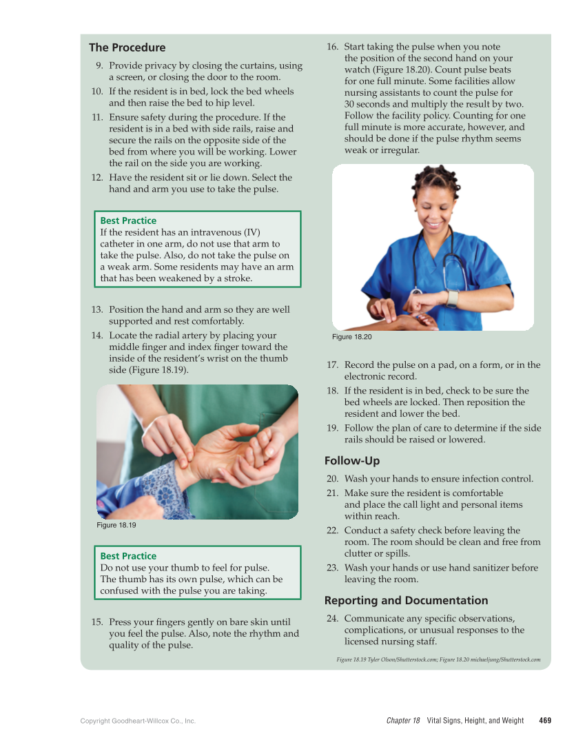 Copyright Goodheart-Willcox Co., Inc. Chapter 18 Vital Signs, Height, and Weight 469 The Procedure 9. Provide privacy by closing the curtains, using a screen, or closing the door to the room. 10. If the resident is in bed, lock the bed wheels and then raise the bed to hip level. 11. Ensure safety during the procedure. If the resident is in a bed with side rails, raise and secure the rails on the opposite side of the bed from where you will be working. Lower the rail on the side you are working. 12. Have the resident sit or lie down. Select the hand and arm you use to take the pulse. Best Practice If the resident has an intravenous (IV) catheter in one arm, do not use that arm to take the pulse. Also, do not take the pulse on a weak arm. Some residents may have an arm that has been weakened by a stroke. 13. Position the hand and arm so they are well supported and rest comfortably. 14. Locate the radial artery by placing your middle finger and index finger toward the inside of the resident’s wrist on the thumb side (Figure 18.19). Figure 18.19 Best Practice Do not use your thumb to feel for pulse. The thumb has its own pulse, which can be confused with the pulse you are taking. 15. Press your fingers gently on bare skin until you feel the pulse. Also, note the rhythm and quality of the pulse. 16. Start taking the pulse when you note the position of the second hand on your watch (Figure 18.20). Count pulse beats for one full minute. Some facilities allow nursing assistants to count the pulse for 30 seconds and multiply the result by two. Follow the facility policy. Counting for one full minute is more accurate, however, and should be done if the pulse rhythm seems weak or irregular. Figure 18.20 17. Record the pulse on a pad, on a form, or in the electronic record. 18. If the resident is in bed, check to be sure the bed wheels are locked. Then reposition the resident and lower the bed. 19. Follow the plan of care to determine if the side rails should be raised or lowered. Follow-Up 20. Wash your hands to ensure infection control. 21. Make sure the resident is comfortable and place the call light and personal items within reach. 22. Conduct a safety check before leaving the room. The room should be clean and free from clutter or spills. 23. Wash your hands or use hand sanitizer before leaving the room. Reporting and Documentation 24. Communicate any specific observations, complications, or unusual responses to the licensed nursing staff. Figure 18.19 Tyler Olson/Shutterstock.com Figure 18.20 michaeljung/Shutterstock.com
