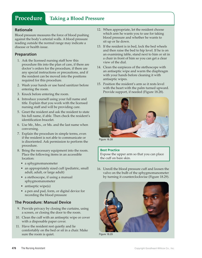 476 The Nursing Assistant Copyright Goodheart-Willcox Co., Inc. Rationale Blood pressure measures the force of blood pushing against the body’s arterial walls. A blood pressure reading outside the normal range may indicate a disease or health issue. Preparation 1. Ask the licensed nursing staff how this procedure fits into the plan of care, if there are doctor’s orders for the procedure, if there are any special instructions or precautions, and if the resident can be moved into the positions required for this procedure. 2. Wash your hands or use hand sanitizer before entering the room. 3. Knock before entering the room. 4. Introduce yourself using your full name and title. Explain that you work with the licensed nursing staff and will be providing care. 5. Greet the resident and ask the resident to state his full name, if able. Then check the resident’s identification bracelet. 6. Use Mr., Mrs., or Ms. and the last name when conversing. 7. Explain the procedure in simple terms, even if the resident is not able to communicate or is disoriented. Ask permission to perform the procedure. 8. Bring the necessary equipment into the room. Place the following items in an accessible location: • a sphygmomanometer • an appropriately sized cuff (pediatric, small adult, adult, or large adult) • a stethoscope, if using a manual sphygmomanometer • antiseptic wipe(s) • a pen and pad, form, or digital device for recording the blood pressure The Procedure: Manual Device 9. Provide privacy by closing the curtains, using a screen, or closing the door to the room. 10. Clean the cuff with an antiseptic wipe or cover with a disposable paper cover. 11. Have the resident rest quietly and lie comfortably on the bed or sit in a chair. Make sure the room is quiet. 12. When appropriate, let the resident choose which arm he wants you to use for taking blood pressure and whether he wants to sit up or lie down. 13. If the resident is in bed, lock the bed wheels and then raise the bed to hip level. If he is on an examining table, stand next to him or sit in a chair in front of him so you can get a clear view of the dial. 14. Clean the earpieces of the stethoscope with an antiseptic wipe and warm the diaphragm with your hands before cleaning it with antiseptic wipes. 15. Position the resident’s arm so it rests level with the heart with the palm turned upward. Provide support, if needed (Figure 18.28). Figure 18.28 Best Practice Expose the upper arm so that you can place the cuff on bare skin. 16. Unroll the blood pressure cuff and loosen the valve on the bulb of the sphygmomanometer by turning it counterclockwise (Figure 18.29). Figure 18.29 Taking a Blood Pressure Procedure