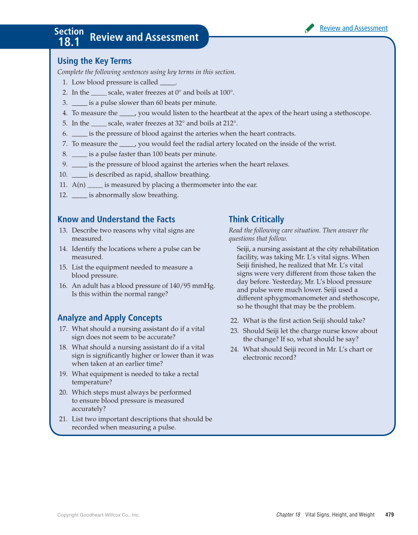 Copyright Goodheart-Willcox Co., Inc. Chapter 18 Vital Signs, Height, and Weight 479 Know and Understand the Facts 13. Describe two reasons why vital signs are measured. 14. Identify the locations where a pulse can be measured. 15. List the equipment needed to measure a blood pressure. 16. An adult has a blood pressure of 140/95 mmHg. Is this within the normal range? Analyze and Apply Concepts 17. What should a nursing assistant do if a vital sign does not seem to be accurate? 18. What should a nursing assistant do if a vital sign is significantly higher or lower than it was when taken at an earlier time? 19. What equipment is needed to take a rectal temperature? 20. Which steps must always be performed to ensure blood pressure is measured accurately? 21. List two important descriptions that should be recorded when measuring a pulse. Think Critically Read the following care situation. Then answer the questions that follow. Seiji, a nursing assistant at the city rehabilitation facility, was taking Mr. L’s vital signs. When Seiji finished, he realized that Mr. L’s vital signs were very different from those taken the day before. Yesterday, Mr. L’s blood pressure and pulse were much lower. Seiji used a different sphygmomanometer and stethoscope, so he thought that may be the problem. 22. What is the first action Seiji should take? 23. Should Seiji let the charge nurse know about the change? If so, what should he say? 24. What should Seiji record in Mr. L’s chart or electronic record? Using the Key Terms Complete the following sentences using key terms in this section. 1. Low blood pressure is called _____. 2. In the _____ scale, water freezes at 0° and boils at 100°. 3. _____ is a pulse slower than 60 beats per minute. 4. To measure the _____, you would listen to the heartbeat at the apex of the heart using a stethoscope. 5. In the _____ scale, water freezes at 32° and boils at 212°. 6. _____ is the pressure of blood against the arteries when the heart contracts. 7. To measure the _____, you would feel the radial artery located on the inside of the wrist. 8. _____ is a pulse faster than 100 beats per minute. 9. _____ is the pressure of blood against the arteries when the heart relaxes. 10. _____ is described as rapid, shallow breathing. 11. A(n) _____ is measured by placing a thermometer into the ear. 12. _____ is abnormally slow breathing. Review and Assessment 18.1 Section Review and Assessment