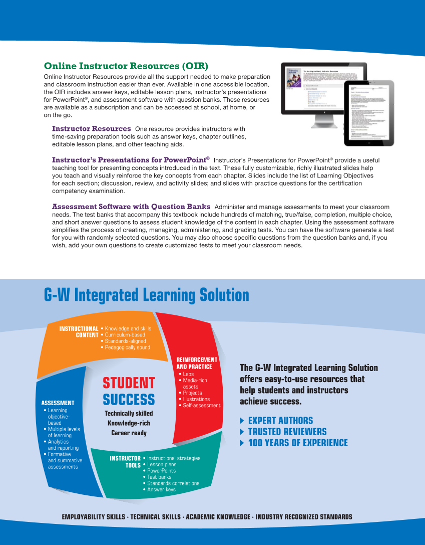 ASSESSMENT • Learning objective- based • Multiple levels of learning • Analytics and reporting • Formative and summative assessments • Knowledge and skills • Curriculum-based • Standards-aligned • Pedagogically sound INSTRUCTIONAL CONTENT INSTRUCTOR TOOLS • Instructional strategies • Lesson plans • PowerPoints • Test banks • Standards correlations • Answer keys REINFORCEMENT AND PRACTICE • Labs • Media-rich assets • Projects • Illustrations • Self-assessment STUDENT SUCCESS Technically skilled Knowledge-rich Career ready Online Instructor Resources (OIR) Online Instructor Resources provide all the support needed to make preparation and classroom instruction easier than ever. Available in one accessible location, the OIR includes answer keys, editable lesson plans, instructor’s presentations for PowerPoint®, and assessment software with question banks. These resources are available as a subscription and can be accessed at school, at home, or on the go. Instructor Resources One resource provides instructors with time-saving preparation tools such as answer keys, chapter outlines, editable lesson plans, and other teaching aids. Instructor’s Presentations for PowerPoint® Instructor’s Presentations for PowerPoint® provide a useful teaching tool for presenting concepts introduced in the text. These fully customizable, richly illustrated slides help you teach and visually reinforce the key concepts from each chapter. Slides include the list of Learning Objectives for each section discussion, review, and activity slides and slides with practice questions for the certification competency examination. Assessment Software with Question Banks Administer and manage assessments to meet your classroom needs. The test banks that accompany this textbook include hundreds of matching, true/false, completion, multiple choice, and short answer questions to assess student knowledge of the content in each chapter. Using the assessment software simplifies the process of creating, managing, administering, and grading tests. You can have the software generate a test for you with randomly selected questions. You may also choose specific questions from the question banks and, if you wish, add your own questions to create customized tests to meet your classroom needs. EMPLOYABILITY SKILLS ∙ TECHNICAL SKILLS ∙ ACADEMIC KNOWLEDGE ∙ INDUSTRY RECOGNIZED STANDARDS The G-W Integrated Learning Solution offers easy-to-use resources that help students and instructors achieve success. EXPERT AUTHORS TRUSTED REVIEWERS 100 YEARS OF EXPERIENCE G-W Integrated Learning Solution