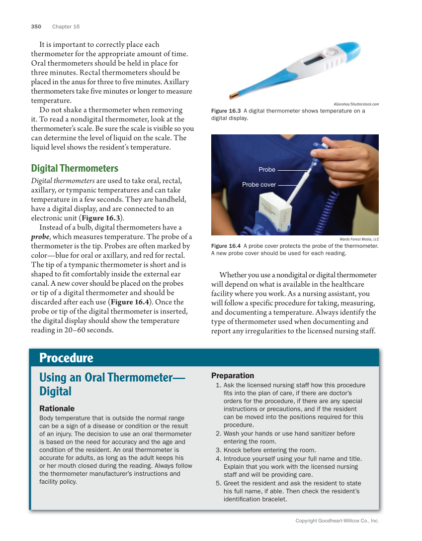 350 Chapter 16 It is important to correctly place each thermometer for the appropriate amount of time. Oral thermometers should be held in place for three minutes. Rectal thermometers should be placed in the anus for three to five minutes. Axillary thermometers take five minutes or longer to measure temperature. Do not shake a thermometer when removing it. To read a nondigital thermometer, look at the thermometer’s scale. Be sure the scale is visible so you can determine the level of liquid on the scale. The liquid level shows the resident’s temperature. Digital Thermometers Digital thermometers are used to take oral, rectal, axillary, or tympanic temperatures and can take temperature in a few seconds. They are handheld, have a digital display, and are connected to an electronic unit (Figure 16.3). Instead of a bulb, digital thermometers have a probe, which measures temperature. The probe of a thermometer is the tip. Probes are often marked by color—blue for oral or axillary, and red for rectal. The tip of a tympanic thermometer is short and is shaped to fit comfortably inside the external ear canal. A new cover should be placed on the probes or tip of a digital thermometer and should be discarded after each use (Figure 16.4). Once the probe or tip of the digital thermometer is inserted, the digital display should show the temperature reading in 20–60 seconds. Whether you use a nondigital or digital thermometer will depend on what is available in the healthcare facility where you work. As a nursing assistant, you will follow a specific procedure for taking, measuring, and documenting a temperature. Always identify the type of thermometer used when documenting and report any irregularities to the licensed nursing staff. AGorohov/Shutterstock.com Figure 16.3 A digital thermometer shows temperature on a digital display. Probe Probe cover Wards Forest Media, LLC Figure 16.4 A probe cover protects the probe of the thermometer. A new probe cover should be used for each reading. Procedure Using an Oral Thermometer— Digital Rationale Body temperature that is outside the normal range can be a sign of a disease or condition or the result of an injury. The decision to use an oral thermometer is based on the need for accuracy and the age and condition of the resident. An oral thermometer is accurate for adults, as long as the adult keeps his or her mouth closed during the reading. Always follow the thermometer manufacturer’s instructions and facility policy. Preparation 1. Ask the licensed nursing staff how this procedure fits into the plan of care, if there are doctor’s orders for the procedure, if there are any special instructions or precautions, and if the resident can be moved into the positions required for this procedure. 2. Wash your hands or use hand sanitizer before entering the room. 3. Knock before entering the room. 4. Introduce yourself using your full name and title. Explain that you work with the licensed nursing staff and will be providing care. 5. Greet the resident and ask the resident to state his full name, if able. Then check the resident’s identification bracelet. Copyright Goodheart-Willcox Co., Inc.