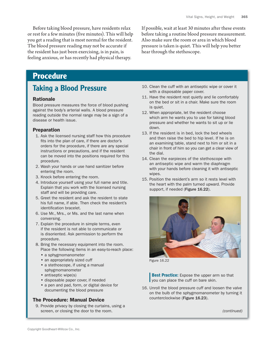 Vital Signs, Height, and Weight 365 If possible, wait at least 30 minutes after these events before taking a routine blood pressure measurement. Also make sure the room or area in which blood pressure is taken is quiet. This will help you better hear through the stethoscope. Before taking blood pressure, have residents relax or rest for a few minutes (five minutes). This will help you get a reading that is most normal for the resident. The blood pressure reading may not be accurate if the resident has just been exercising, is in pain, is feeling anxious, or has recently had physical therapy. Procedure Taking a Blood Pressure Rationale Blood pressure measures the force of blood pushing against the body’s arterial walls. A blood pressure reading outside the normal range may be a sign of a disease or health issue. Preparation 1. Ask the licensed nursing staff how this procedure fits into the plan of care, if there are doctor’s orders for the procedure, if there are any special instructions or precautions, and if the resident can be moved into the positions required for this procedure. 2. Wash your hands or use hand sanitizer before entering the room. 3. Knock before entering the room. 4. Introduce yourself using your full name and title. Explain that you work with the licensed nursing staff and will be providing care. 5. Greet the resident and ask the resident to state his full name, if able. Then check the resident’s identification bracelet. 6. Use Mr., Mrs., or Ms. and the last name when conversing. 7. Explain the procedure in simple terms, even if the resident is not able to communicate or is disoriented. Ask permission to perform the procedure. 8. Bring the necessary equipment into the room. Place the following items in an easy-to-reach place: • a sphygmomanometer • an appropriately sized cuff • a stethoscope, if using a manual sphygmomanometer • antiseptic wipe(s) • disposable paper cover, if needed • a pen and pad, form, or digital device for documenting the blood pressure The Procedure: Manual Device 9. Provide privacy by closing the curtains, using a screen, or closing the door to the room. 10. Clean the cuff with an antiseptic wipe or cover it with a disposable paper cover. 11. Have the resident rest quietly and lie comfortably on the bed or sit in a chair. Make sure the room is quiet. 12. When appropriate, let the resident choose which arm he wants you to use for taking blood pressure and whether he wants to sit up or lie down. 13. If the resident is in bed, lock the bed wheels and then raise the bed to hip level. If he is on an examining table, stand next to him or sit in a chair in front of him so you can get a clear view of the dial. 14. Clean the earpieces of the stethoscope with an antiseptic wipe and warm the diaphragm with your hands before cleaning it with antiseptic wipes. 15. Position the resident’s arm so it rests level with the heart with the palm turned upward. Provide support, if needed (Figure 16.22). Figure 16.22 Best Practice: Expose the upper arm so that you can place the cuff on bare skin. 16. Unroll the blood pressure cuff and loosen the valve on the bulb of the sphygmomanometer by turning it counterclockwise (Figure 16.23). (continued) Copyright Goodheart-Willcox Co., Inc.