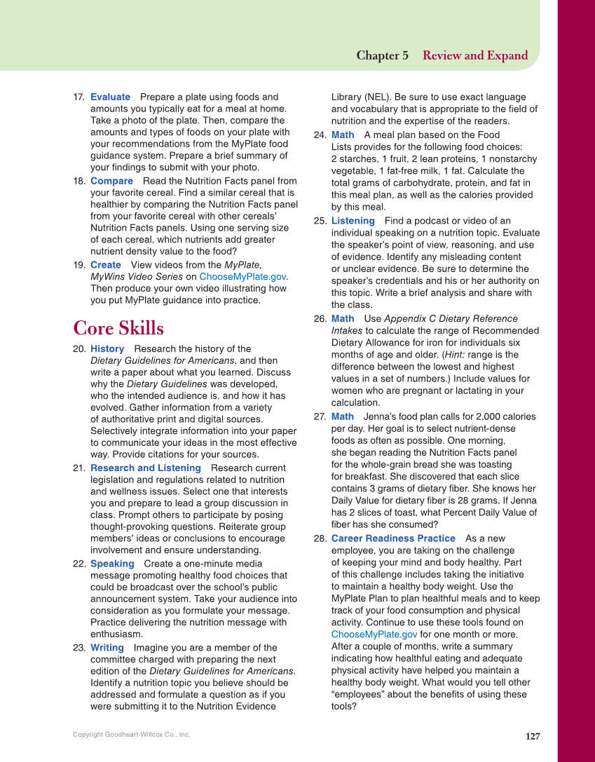 Copyright Goodheart-Willcox Co., Inc. Chapter 5 Review and Expand 127 17. Evaluate Prepare a plate using foods and amounts you typically eat for a meal at home. Take a photo of the plate. Then, compare the amounts and types of foods on your plate with your recommendations from the MyPlate food guidance system. Prepare a brief summary of your findings to submit with your photo. 18. Compare Read the Nutrition Facts panel from your favorite cereal. Find a similar cereal that is healthier by comparing the Nutrition Facts panel from your favorite cereal with other cereals’ Nutrition Facts panels. Using one serving size of each cereal, which nutrients add greater nutrient density value to the food? 19. Create View videos from the MyPlate, MyWins Video Series on ChooseMyPlate.gov. Then produce your own video illustrating how you put MyPlate guidance into practice. Core Skills 20. History Research the history of the Dietary Guidelines for Americans, and then write a paper about what you learned. Discuss why the Dietary Guidelines was developed, who the intended audience is, and how it has evolved. Gather information from a variety of authoritative print and digital sources. Selectively integrate information into your paper to communicate your ideas in the most effective way. Provide citations for your sources. 21. Research and Listening Research current legislation and regulations related to nutrition and wellness issues. Select one that interests you and prepare to lead a group discussion in class. Prompt others to participate by posing thought-provoking questions. Reiterate group members’ ideas or conclusions to encourage involvement and ensure understanding. 22. Speaking Create a one-minute media message promoting healthy food choices that could be broadcast over the school’s public announcement system. Take your audience into consideration as you formulate your message. Practice delivering the nutrition message with enthusiasm. 23. Writing Imagine you are a member of the committee charged with preparing the next edition of the Dietary Guidelines for Americans. Identify a nutrition topic you believe should be addressed and formulate a question as if you were submitting it to the Nutrition Evidence Library (NEL). Be sure to use exact language and vocabulary that is appropriate to the field of nutrition and the expertise of the readers. 24. Math A meal plan based on the Food Lists provides for the following food choices: 2 starches, 1 fruit, 2 lean proteins, 1 nonstarchy vegetable, 1 fat-free milk, 1 fat. Calculate the total grams of carbohydrate, protein, and fat in this meal plan, as well as the calories provided by this meal. 25. Listening Find a podcast or video of an individual speaking on a nutrition topic. Evaluate the speaker’s point of view, reasoning, and use of evidence. Identify any misleading content or unclear evidence. Be sure to determine the speaker’s credentials and his or her authority on this topic. Write a brief analysis and share with the class. 26. Math Use Appendix C Dietary Reference Intakes to calculate the range of Recommended Dietary Allowance for iron for individuals six months of age and older. (Hint: range is the difference between the lowest and highest values in a set of numbers.) Include values for women who are pregnant or lactating in your calculation. 27. Math Jenna’s food plan calls for 2,000 calories per day. Her goal is to select nutrient-dense foods as often as possible. One morning, she began reading the Nutrition Facts panel for the whole-grain bread she was toasting for breakfast. She discovered that each slice contains 3 grams of dietary fiber. She knows her Daily Value for dietary fiber is 28 grams. If Jenna has 2 slices of toast, what Percent Daily Value of fiber has she consumed? 28. Career Readiness Practice As a new employee, you are taking on the challenge of keeping your mind and body healthy. Part of this challenge includes taking the initiative to maintain a healthy body weight. Use the MyPlate Plan to plan healthful meals and to keep track of your food consumption and physical activity. Continue to use these tools found on ChooseMyPlate.gov for one month or more. After a couple of months, write a summary indicating how healthful eating and adequate physical activity have helped you maintain a healthy body weight. What would you tell other “employees” about the benefits of using these tools?