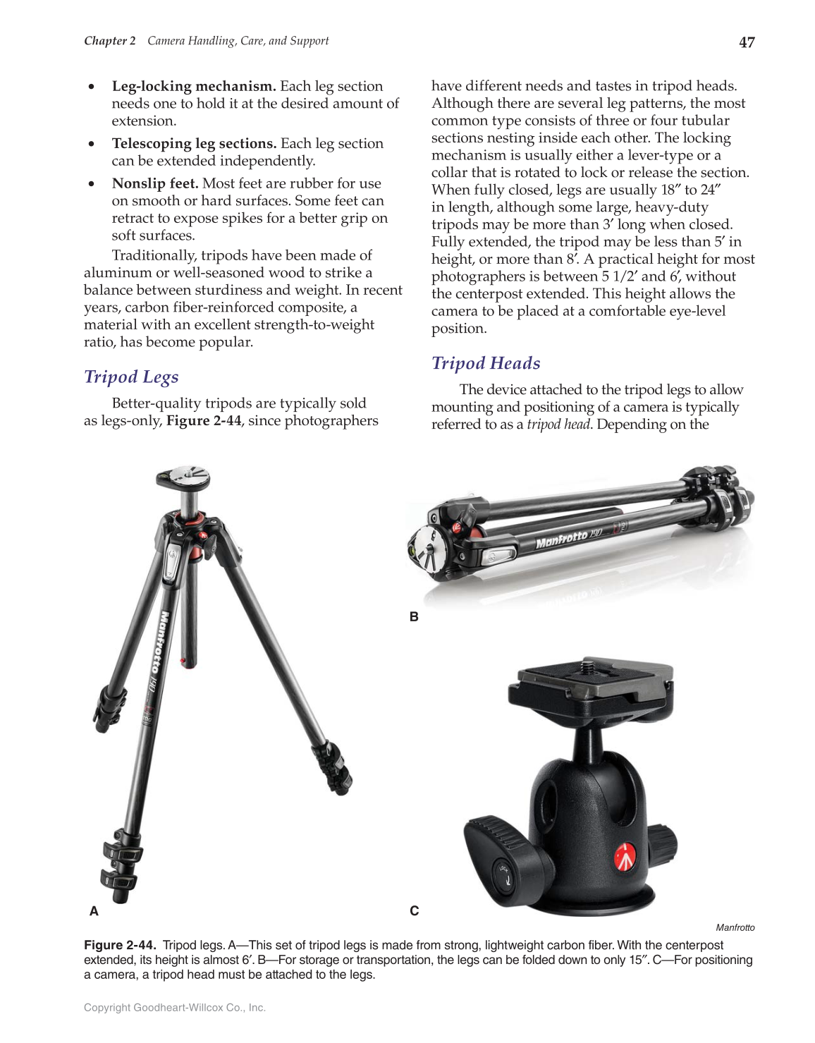 Figure 2-44. Tripod legs. A—This set of tripod legs is made from strong, lightweight carbon fiber. With the centerpost