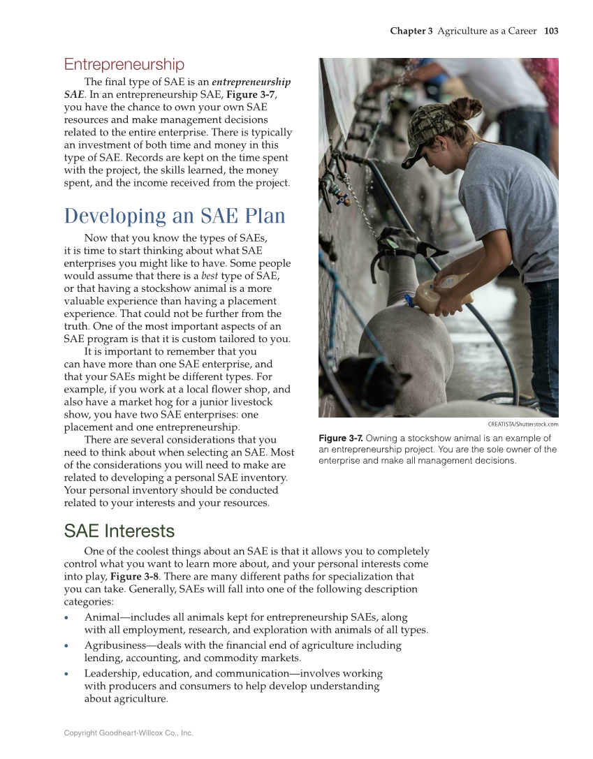 Chapter 3 Agriculture as a Career 103 Copyright Goodheart-Willcox Co., Inc. Entrepreneurship The final type of SAE is an entrepreneurship SAE. In an entrepreneurship SAE, Figure 3-7, you have the chance to own your own SAE resources and make management decisions related to the entire enterprise. There is typically an investment of both time and money in this type of SAE. Records are kept on the time spent with the project, the skills learned, the money spent, and the income received from the project. Developing an SAE Plan Now that you know the types of SAEs, it is time to start thinking about what SAE enterprises you might like to have. Some people would assume that there is a best type of SAE, or that having a stockshow animal is a more valuable experience than having a placement experience. That could not be further from the truth. One of the most important aspects of an SAE program is that it is custom tailored to you. It is important to remember that you can have more than one SAE enterprise, and that your SAEs might be different types. For example, if you work at a local flower shop, and also have a market hog for a junior livestock show, you have two SAE enterprises: one placement and one entrepreneurship. There are several considerations that you need to think about when selecting an SAE. Most of the considerations you will need to make are related to developing a personal SAE inventory. Your personal inventory should be conducted related to your interests and your resources. SAE Interests One of the coolest things about an SAE is that it allows you to completely control what you want to learn more about, and your personal interests come into play, Figure 3-8. There are many different paths for specialization that you can take. Generally, SAEs will fall into one of the following description categories: „ Animal—includes all animals kept for entrepreneurship SAEs, along with all employment, research, and exploration with animals of all types. „ Agribusiness—deals with the financial end of agriculture including lending, accounting, and commodity markets. „ Leadership, education, and communication—involves working with producers and consumers to help develop understanding about agriculture. CREATISTA/Shutterstock.com Figure 3-7. Owning a stockshow animal is an example of an entrepreneurship project. You are the sole owner of the enterprise and make all management decisions.