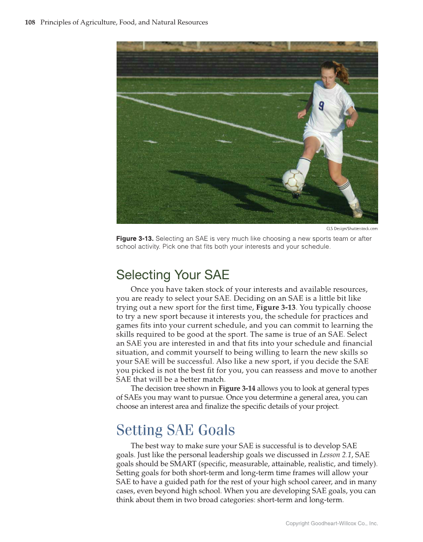 108 Principles of Agriculture, Food, and Natural Resources Copyright Goodheart-Willcox Co., Inc. Selecting Your SAE Once you have taken stock of your interests and available resources, you are ready to select your SAE. Deciding on an SAE is a little bit like trying out a new sport for the first time, Figure 3-13. You typically choose to try a new sport because it interests you, the schedule for practices and games fits into your current schedule, and you can commit to learning the skills required to be good at the sport. The same is true of an SAE. Select an SAE you are interested in and that fits into your schedule and financial situation, and commit yourself to being willing to learn the new skills so your SAE will be successful. Also like a new sport, if you decide the SAE you picked is not the best fit for you, you can reassess and move to another SAE that will be a better match. The decision tree shown in Figure 3-14 allows you to look at general types of SAEs you may want to pursue. Once you determine a general area, you can choose an interest area and finalize the specific details of your project. Setting SAE Goals The best way to make sure your SAE is successful is to develop SAE goals. Just like the personal leadership goals we discussed in Lesson 2.1, SAE goals should be SMART (specific, measurable, attainable, realistic, and timely). Setting goals for both short-term and long-term time frames will allow your SAE to have a guided path for the rest of your high school career, and in many cases, even beyond high school. When you are developing SAE goals, you can think about them in two broad categories: short-term and long-term. CLS Design/Shutterstock.com Figure 3-13. Selecting an SAE is very much like choosing a new sports team or after school activity. Pick one that fits both your interests and your schedule.