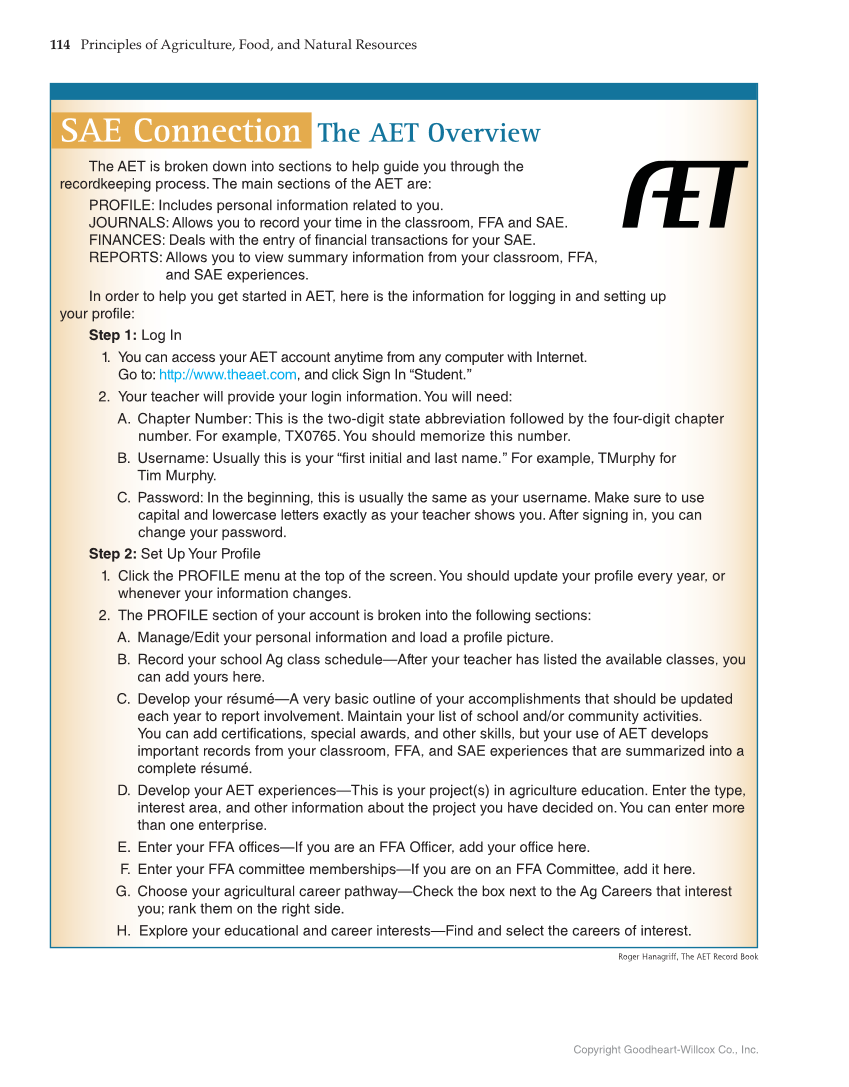 114 Principles of Agriculture, Food, and Natural Resources Copyright Goodheart-Willcox Co., Inc. SAE Connection The AET Overview The AET is broken down into sections to help guide you through the recordkeeping process. The main sections of the AET are: PROFILE: Includes personal information related to you. JOURNALS: Allows you to record your time in the classroom, FFA and SAE. FINANCES: Deals with the entry of financial transactions for your SAE. REPORTS: Allows you to view summary information from your classroom, FFA, and SAE experiences. In order to help you get started in AET, here is the information for logging in and setting up your profile: Step 1: Log In 1. You can access your AET account anytime from any computer with Internet. Go to: http://www.theaet.com, and click Sign In “Student. ” 2. Your teacher will provide your login information. You will need: A. Chapter Number: This is the two-digit state abbreviation followed by the four-digit chapter number. For example, TX0765. You should memorize this number. B. Username: Usually this is your “first initial and last name. ” For example, TMurphy for Tim Murphy. C. Password: In the beginning, this is usually the same as your username. Make sure to use capital and lowercase letters exactly as your teacher shows you. After signing in, you can change your password. Step 2: Set Up Your Profile 1. Click the PROFILE menu at the top of the screen. You should update your profile every year, or whenever your information changes. 2. The PROFILE section of your account is broken into the following sections: A. Manage/Edit your personal information and load a profile picture. B. Record your school Ag class schedule—After your teacher has listed the available classes, you can add yours here. C. Develop your résumé—A very basic outline of your accomplishments that should be updated each year to report involvement. Maintain your list of school and/or community activities. You can add certifications, special awards, and other skills, but your use of AET develops important records from your classroom, FFA, and SAE experiences that are summarized into a complete résumé. D. Develop your AET experiences—This is your project(s) in agriculture education. Enter the type, interest area, and other information about the project you have decided on. You can enter more than one enterprise. E. Enter your FFA offices—If you are an FFA Officer, add your office here. F. Enter your FFA committee memberships—If you are on an FFA Committee, add it here. G. Choose your agricultural career pathway—Check the box next to the Ag Careers that interest you rank them on the right side. H. Explore your educational and career interests—Find and select the careers of interest. Roger Hanagriff, The AET Record Book