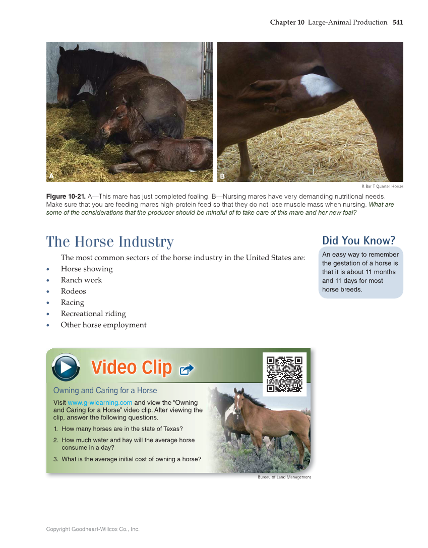 The Horse Industry The most common sectors of the horse industry in the United States are: „ Horse showing „ Ranch work „ Rodeos „ Racing „ Recreational riding „ Other horse employment Did You Know? An easy way to remember the gestation of a horse is that it is about 11 months and 11 days for most horse breeds. Owning and Caring for a Horse Visit www.g-wlearning.com and view the “Owning and Caring for a Horse” video clip. After viewing the clip, answer the following questions. 1. How many horses are in the state of Texas? 2. How much water and hay will the average horse consume in a day? 3. What is the average initial cost of owning a horse? Video Clip Bureau of Land Management R Bar T Quarter Horses Figure 10-21. A—This mare has just completed foaling. B—Nursing mares have very demanding nutritional needs. Make sure that you are feeding mares high-protein feed so that they do not lose muscle mass when nursing. What are some of the considerations that the producer should be mindful of to take care of this mare and her new foal? A B Chapter 10 Large-Animal Production 541 Copyright Goodheart-Willcox Co., Inc.