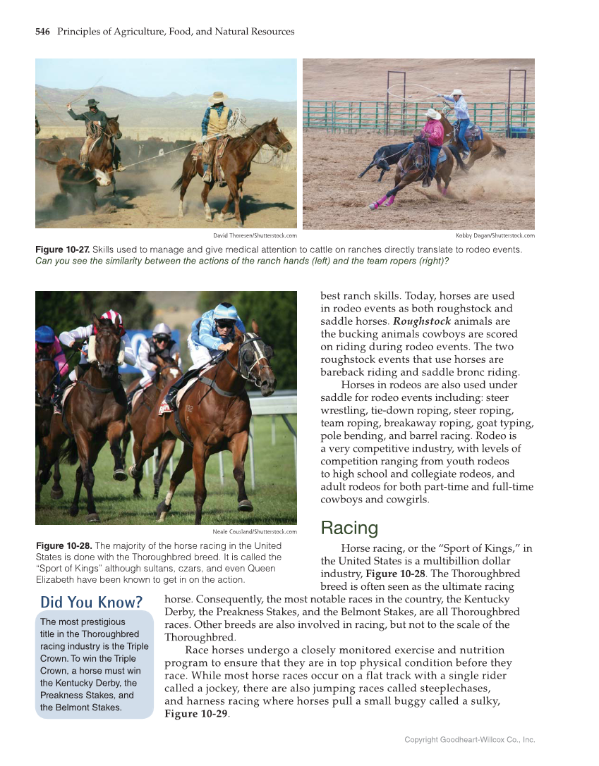 best ranch skills. Today, horses are used in rodeo events as both roughstock and saddle horses. Roughstock animals are the bucking animals cowboys are scored on riding during rodeo events. The two roughstock events that use horses are bareback riding and saddle bronc riding. Horses in rodeos are also used under saddle for rodeo events including: steer wrestling, tie-down roping, steer roping, team roping, breakaway roping, goat typing, pole bending, and barrel racing. Rodeo is a very competitive industry, with levels of competition ranging from youth rodeos to high school and collegiate rodeos, and adult rodeos for both part-time and full-time cowboys and cowgirls. Racing Horse racing, or the “Sport of Kings,” in the United States is a multibillion dollar industry, Figure 10-28. The Thoroughbred breed is often seen as the ultimate racing horse. Consequently, the most notable races in the country, the Kentucky Derby, the Preakness Stakes, and the Belmont Stakes, are all Thoroughbred races. Other breeds are also involved in racing, but not to the scale of the Thoroughbred. Race horses undergo a closely monitored exercise and nutrition program to ensure that they are in top physical condition before they race. While most horse races occur on a flat track with a single rider called a jockey, there are also jumping races called steeplechases, and harness racing where horses pull a small buggy called a sulky, Figure 10-29. Did You Know? The most prestigious title in the Thoroughbred racing industry is the Triple Crown. To win the Triple Crown, a horse must win the Kentucky Derby, the Preakness Stakes, and the Belmont Stakes. Neale Cousland/Shutterstock.com Figure 10-28. The majority of the horse racing in the United States is done with the Thoroughbred breed. It is called the “Sport of Kings” although sultans, czars, and even Queen Elizabeth have been known to get in on the action. Kobby Dagan/Shutterstock.com Figure 10-27. Skills used to manage and give medical attention to cattle on ranches directly translate to rodeo events. Can you see the similarity between the actions of the ranch hands (left) and the team ropers (right)? David Thoresen/Shutterstock.com 546 Principles of Agriculture, Food, and Natural Resources Copyright Goodheart-Willcox Co., Inc.