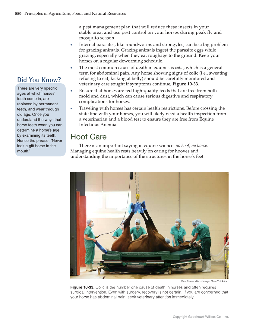 a pest management plan that will reduce these insects in your stable area, and use pest control on your horses during peak fly and mosquito season. „ Internal parasites, like roundworms and strongyles, can be a big problem for grazing animals. Grazing animals ingest the parasite eggs while grazing, especially when they eat roughage to the ground. Keep your horses on a regular deworming schedule. „ The most common cause of death in equines is colic, which is a general term for abdominal pain. Any horse showing signs of colic (i.e., sweating, refusing to eat, kicking at belly) should be carefully monitored and veterinary care sought if symptoms continue, Figure 10-33. „ Ensure that horses are fed high-quality feeds that are free from both mold and dust, which can cause serious digestive and respiratory complications for horses. „ Traveling with horses has certain health restrictions. Before crossing the state line with your horses, you will likely need a health inspection from a veterinarian and a blood test to ensure they are free from Equine Infectious Anemia. Hoof Care There is an important saying in equine science: no hoof, no horse. Managing equine health rests heavily on caring for hooves and understanding the importance of the structures in the horse’s feet. Did You Know? There are very specific ages at which horses’ teeth come in, are replaced by permanent teeth, and wear through old age. Once you understand the ways that horse teeth wear, you can determine a horse’s age by examining its teeth. Hence the phrase, “Never look a gift horse in the mouth.” Dan Kitwood/Getty Images News/Thinkstock Figure 10-33. Colic is the number one cause of death in horses and often requires surgical intervention. Even with surgery, recovery is not certain. If you are concerned that your horse has abdominal pain, seek veterinary attention immediately. 550 Principles of Agriculture, Food, and Natural Resources Copyright Goodheart-Willcox Co., Inc.