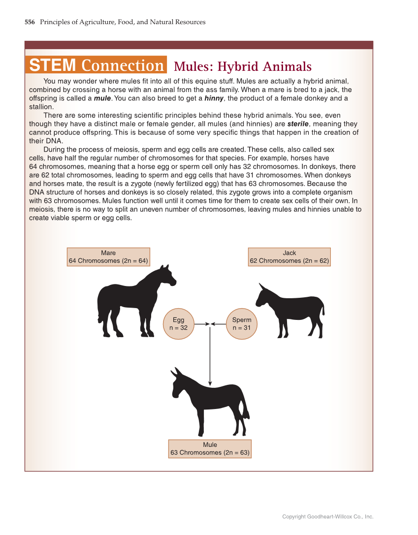 You may wonder where mules fit into all of this equine stuff. Mules are actually a hybrid animal, combined by crossing a horse with an animal from the ass family. When a mare is bred to a jack, the offspring is called a mule. You can also breed to get a hinny, the product of a female donkey and a stallion. There are some interesting scientific principles behind these hybrid animals. You see, even though they have a distinct male or female gender, all mules (and hinnies) are sterile, meaning they cannot produce offspring. This is because of some very specific things that happen in the creation of their DNA. During the process of meiosis, sperm and egg cells are created. These cells, also called sex cells, have half the regular number of chromosomes for that species. For example, horses have 64 chromosomes, meaning that a horse egg or sperm cell only has 32 chromosomes. In donkeys, there are 62 total chromosomes, leading to sperm and egg cells that have 31 chromosomes. When donkeys and horses mate, the result is a zygote (newly fertilized egg) that has 63 chromosomes. Because the DNA structure of horses and donkeys is so closely related, this zygote grows into a complete organism with 63 chromosomes. Mules function well until it comes time for them to create sex cells of their own. In meiosis, there is no way to split an uneven number of chromosomes, leaving mules and hinnies unable to create viable sperm or egg cells. Mules: Hybrid Animals Connection STEM Jack 62 Chromosomes (2n = 62) Egg n = 32 Sperm n = 31 Mule 63 Chromosomes (2n = 63) Mare 64 Chromosomes (2n = 64) 556 Principles of Agriculture, Food, and Natural Resources Copyright Goodheart-Willcox Co., Inc.
