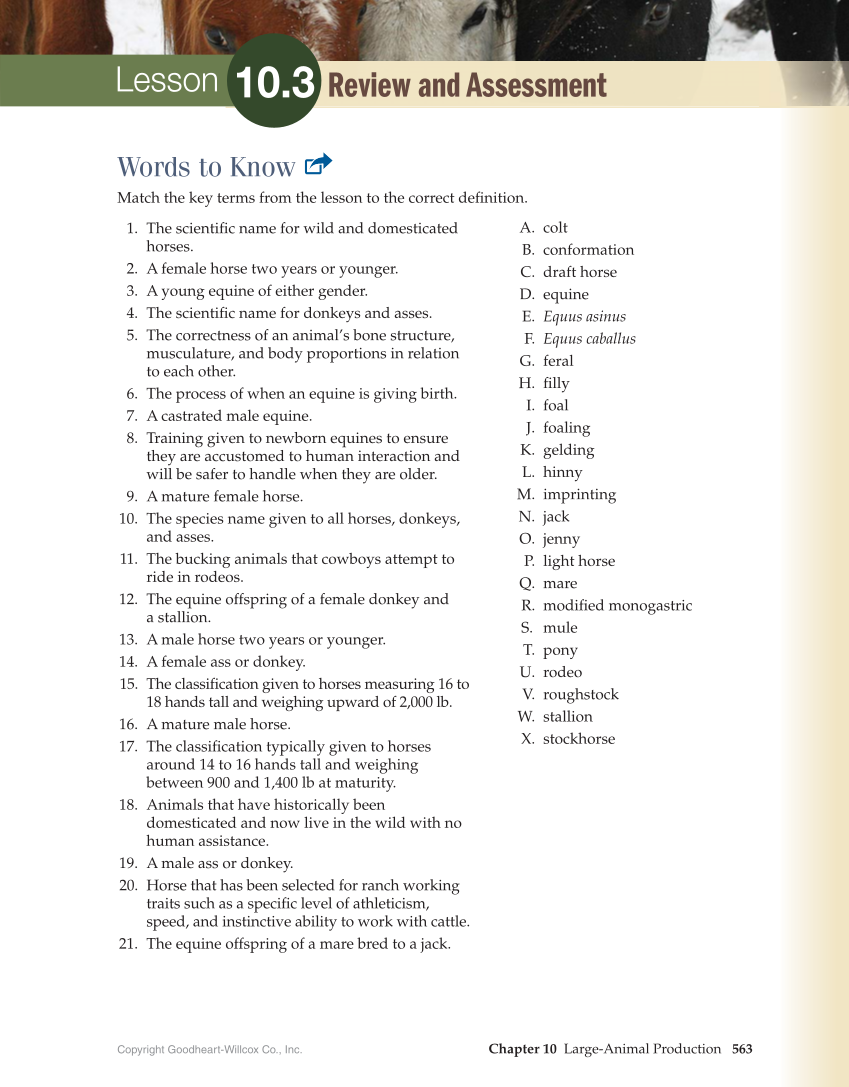 Copyright Goodheart-Willcox Co., Inc. Chapter 10 Large-Animal Production 563 Review and Assessment Lesson 10.3 Words to Know Match the key terms from the lesson to the correct definition. 1. The scientific name for wild and domesticated horses. 2. A female horse two years or younger. 3. A young equine of either gender. 4. The scientific name for donkeys and asses. 5. The correctness of an animal’s bone structure, musculature, and body proportions in relation to each other. 6. The process of when an equine is giving birth. 7. A castrated male equine. 8. Training given to newborn equines to ensure they are accustomed to human interaction and will be safer to handle when they are older. 9. A mature female horse. 10. The species name given to all horses, donkeys, and asses. 11. The bucking animals that cowboys attempt to ride in rodeos. 12. The equine offspring of a female donkey and a stallion. 13. A male horse two years or younger. 14. A female ass or donkey. 15. The classification given to horses measuring 16 to 18 hands tall and weighing upward of 2,000 lb. 16. A mature male horse. 17. The classification typically given to horses around 14 to 16 hands tall and weighing between 900 and 1,400 lb at maturity. 18. Animals that have historically been domesticated and now live in the wild with no human assistance. 19. A male ass or donkey. 20. Horse that has been selected for ranch working traits such as a specific level of athleticism, speed, and instinctive ability to work with cattle. 21. The equine offspring of a mare bred to a jack. A. colt B. conformation C. draft horse D. equine E. Equus asinus F. Equus caballus G. feral H. filly I. foal J. foaling K. gelding L. hinny M. imprinting N. jack O. jenny P. light horse Q. mare R. modified monogastric S. mule T. pony U. rodeo V. roughstock W. stallion X. stockhorse