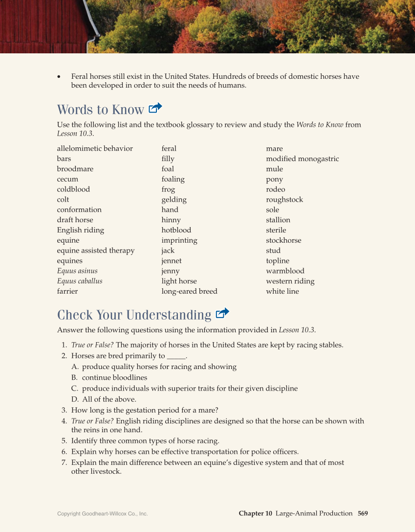 Copyright Goodheart-Willcox Co., Inc. Chapter 10 Large-Animal Production 569 „ Feral horses still exist in the United States. Hundreds of breeds of domestic horses have been developed in order to suit the needs of humans. Words to Know Use the following list and the textbook glossary to review and study the Words to Know from Lesson 10.3. allelomimetic behavior bars broodmare cecum coldblood colt conformation draft horse English riding equine equine assisted therapy equines Equus asinus Equus caballus farrier feral filly foal foaling frog gelding hand hinny hotblood imprinting jack jennet jenny light horse long-eared breed mare modified monogastric mule pony rodeo roughstock sole stallion sterile stockhorse stud topline warmblood western riding white line Check Your Understanding Answer the following questions using the information provided in Lesson 10.3. 1. True or False? The majority of horses in the United States are kept by racing stables. 2. Horses are bred primarily to _____. A. produce quality horses for racing and showing B. continue bloodlines C. produce individuals with superior traits for their given discipline D. All of the above. 3. How long is the gestation period for a mare? 4. True or False? English riding disciplines are designed so that the horse can be shown with the reins in one hand. 5. Identify three common types of horse racing. 6. Explain why horses can be effective transportation for police officers. 7. Explain the main difference between an equine’s digestive system and that of most other livestock.