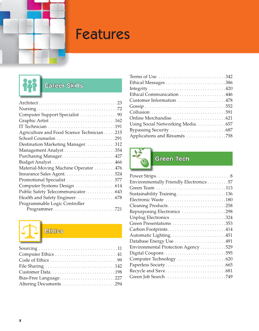 x Features Career Skills Career Skills Architect . . . . . . . . . . . . . . . . . . . . . . . . . . . . . . . . . .23 Nursing. . . . . . . . . . . . . . . . . . . . . . . . . . . . . . . . . . .72 Computer Support Specialist . . . . . . . . . . . . . . . .90 Graphic Artist . . . . . . . . . . . . . . . . . . . . . . . . . . . .162 IT Technician . . . . . . . . . . . . . . . . . . . . . . . . . . . . .191 Agriculture and Food Science Technician . . . . .215 School Counselor. . . . . . . . . . . . . . . . . . . . . . . . . .291 Destination Marketing Manager. . . . . . . . . . . . .312 Management Analyst . . . . . . . . . . . . . . . . . . . . . .354 Purchasing Manager. . . . . . . . . . . . . . . . . . . . . . .427 Budget Analyst . . . . . . . . . . . . . . . . . . . . . . . . . . .466 Material-Moving Machine Operator . . . . . . . . .476 Insurance Sales Agent. . . . . . . . . . . . . . . . . . . . . .524 Promotional Specialist . . . . . . . . . . . . . . . . . . . . .577 Computer Systems Design . . . . . . . . . . . . . . . . .614 Public Safety Telecommunicator. . . . . . . . . . . . .643 Health and Safety Engineer. . . . . . . . . . . . . . . . .678 Programmable Logic Controller Programmer. . . . . . . . . . . . . . . . . . . . . . . . . . .721 Ethics Ethics Sourcing . . . . . . . . . . . . . . . . . . . . . . . . . . . . . . . . . .11 Computer Ethics . . . . . . . . . . . . . . . . . . . . . . . . . . .41 Code of Ethics . . . . . . . . . . . . . . . . . . . . . . . . . . . . .99 File Sharing . . . . . . . . . . . . . . . . . . . . . . . . . . . . . .142 Customer Data. . . . . . . . . . . . . . . . . . . . . . . . . . . .198 Bias-Free Language. . . . . . . . . . . . . . . . . . . . . . . .227 Altering Documents . . . . . . . . . . . . . . . . . . . . . . .294 Terms of Use . . . . . . . . . . . . . . . . . . . . . . . . . . . . .342 Ethical Messages . . . . . . . . . . . . . . . . . . . . . . . . . .386 Integrity . . . . . . . . . . . . . . . . . . . . . . . . . . . . . . . . .420 Ethical Communication . . . . . . . . . . . . . . . . . . . .446 Customer Information . . . . . . . . . . . . . . . . . . . . .478 Gossip . . . . . . . . . . . . . . . . . . . . . . . . . . . . . . . . . . .552 Collusion . . . . . . . . . . . . . . . . . . . . . . . . . . . . . . . .591 Online Merchandise . . . . . . . . . . . . . . . . . . . . . . .621 Using Social Networking Media. . . . . . . . . . . . .657 Bypassing Security . . . . . . . . . . . . . . . . . . . . . . . .687 Applications and Résumés . . . . . . . . . . . . . . . . .758 Green Tech Green Tech Power Strips. . . . . . . . . . . . . . . . . . . . . . . . . . . . . . . .8 Environmentally Friendly Electronics . . . . . . . . .57 Green Team . . . . . . . . . . . . . . . . . . . . . . . . . . . . . .113 Sustainability Training . . . . . . . . . . . . . . . . . . . . .136 Electronic Waste . . . . . . . . . . . . . . . . . . . . . . . . . .180 Cleaning Products. . . . . . . . . . . . . . . . . . . . . . . . .258 Repurposing Electronics . . . . . . . . . . . . . . . . . . .298 Unplug Electronics . . . . . . . . . . . . . . . . . . . . . . . .324 Green Presentations . . . . . . . . . . . . . . . . . . . . . . .353 Carbon Footprints. . . . . . . . . . . . . . . . . . . . . . . . .414 Automatic Lighting. . . . . . . . . . . . . . . . . . . . . . . .451 Database Energy Use . . . . . . . . . . . . . . . . . . . . . .491 Environmental Protection Agency . . . . . . . . . . .529 Digital Coupons . . . . . . . . . . . . . . . . . . . . . . . . . .595 Computer Technology . . . . . . . . . . . . . . . . . . . . .620 Paperless Society. . . . . . . . . . . . . . . . . . . . . . . . . .665 Recycle and Save. . . . . . . . . . . . . . . . . . . . . . . . . .681 Green Job Search . . . . . . . . . . . . . . . . . . . . . . . . . .749