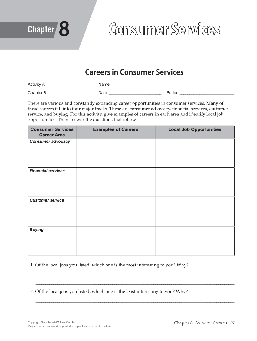 Copyright Goodheart-Willcox Co., Inc. May not be reproduced or posted to a publicly accessible website. Chapter 8 Consumer Services 57 Chapter 8 Consumer Services Careers in Consumer Services Activity A Name______________________________________________________________ Chapter 8 Date___________________________ Period____________________________ There are various and constantly expanding career opportunities in consumer services. Many of these careers fall into four major tracks. These are consumer advocacy, financial services, customer service, and buying. For this activity, give examples of careers in each area and identify local job opportunities. Then answer the questions that follow. Consumer Services Career Area Examples of Careers Local Job Opportunities Consumer advocacy Financial services Customer service Buying 1. Of the local jobs you listed, which one is the most interesting to you? Why? _ ______________________________________________________________________________________________________ _____________________________________________________________________________________________________ 2. Of the local jobs you listed, which one is the least interesting to you? Why? _ ______________________________________________________________________________________________________ _____________________________________________________________________________________________________
