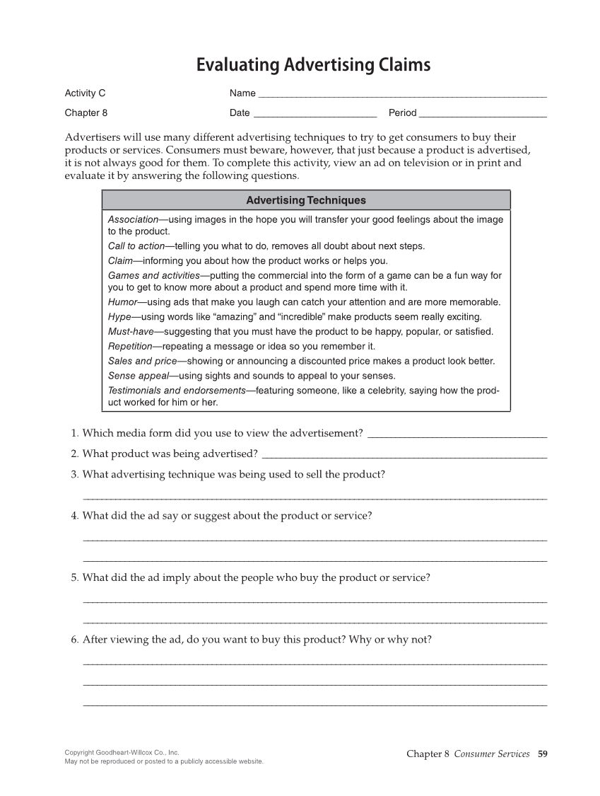Copyright Goodheart-Willcox Co., Inc. May not be reproduced or posted to a publicly accessible website. Chapter 8 Consumer Services 59 Evaluating Advertising Claims Activity C Name______________________________________________________________ Chapter 8 Date___________________________ Period____________________________ Advertisers will use many different advertising techniques to try to get consumers to buy their products or services. Consumers must beware, however, that just because a product is advertised, it is not always good for them. To complete this activity, view an ad on television or in print and evaluate it by answering the following questions. Advertising Techniques Association—using images in the hope you will transfer your good feelings about the image to the product. Call to action—telling you what to do, removes all doubt about next steps. Claim—informing you about how the product works or helps you. Games and activities—putting the commercial into the form of a game can be a fun way for you to get to know more about a product and spend more time with it. Humor—using ads that make you laugh can catch your attention and are more memorable. Hype—using words like “amazing” and “incredible” make products seem really exciting. Must-have—suggesting that you must have the product to be happy, popular, or satisfied. Repetition—repeating a message or idea so you remember it. Sales and price—showing or announcing a discounted price makes a product look better. Sense appeal—using sights and sounds to appeal to your senses. Testimonials and endorsements—featuring someone, like a celebrity, saying how the prod- uct worked for him or her. 1. Which media form did you use to view the advertisement?_ _______________________________________ 2. What product was being advertised?_______________________________________________________________ 3. What advertising technique was being used to sell the product? _ _____________________________________________________________________________________________________ 4. What did the ad say or suggest about the product or service? _ ______________________________________________________________________________________________________ _____________________________________________________________________________________________________ 5. What did the ad imply about the people who buy the product or service? _ ______________________________________________________________________________________________________ _____________________________________________________________________________________________________ 6. After viewing the ad, do you want to buy this product? Why or why not? _ ______________________________________________________________________________________________________ ______________________________________________________________________________________________________ _____________________________________________________________________________________________________