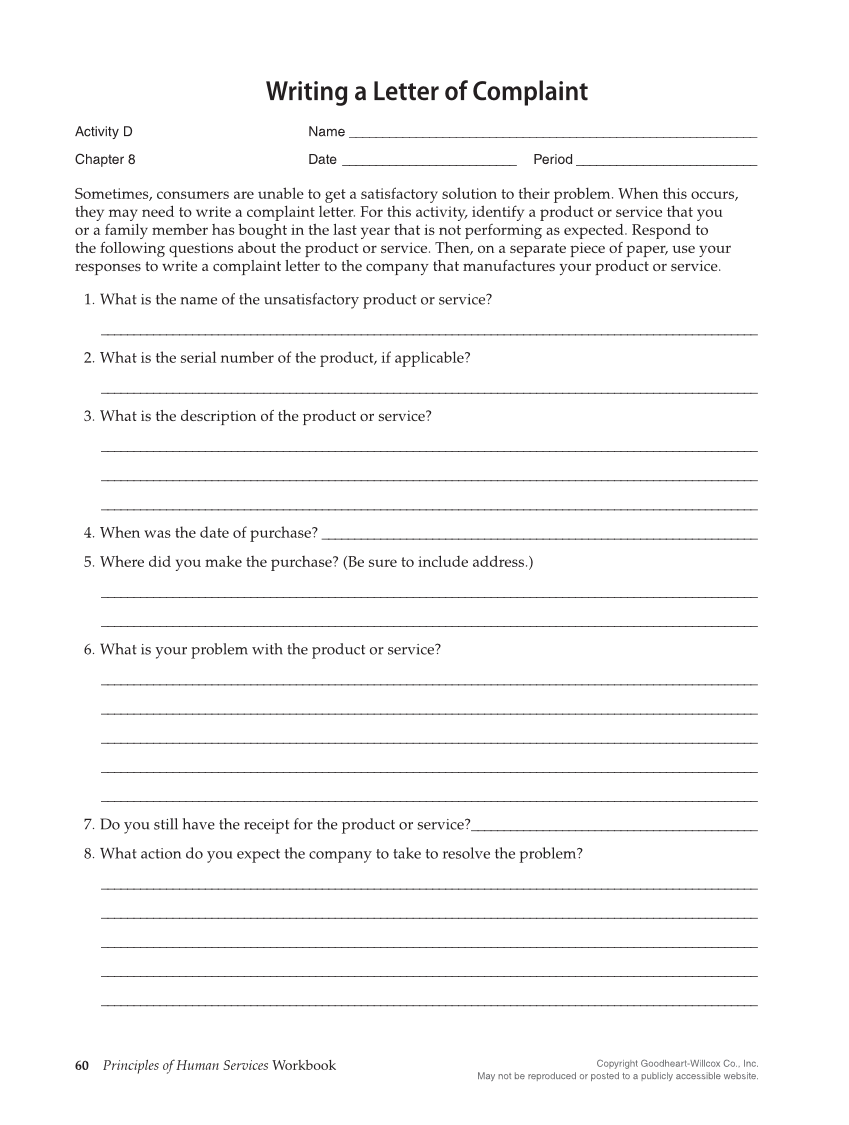 Copyright Goodheart-Willcox Co., Inc. May not be reproduced or posted to a publicly accessible website. 60 Principles of Human Services Workbook Writing a Letter of Complaint Activity D Name______________________________________________________________ Chapter 8 Date___________________________ Period____________________________ Sometimes, consumers are unable to get a satisfactory solution to their problem. When this occurs, they may need to write a complaint letter. For this activity, identify a product or service that you or a family member has bought in the last year that is not performing as expected. Respond to the following questions about the product or service. Then, on a separate piece of paper, use your responses to write a complaint letter to the company that manufactures your product or service. 1. What is the name of the unsatisfactory product or service? _ _____________________________________________________________________________________________________ 2. What is the serial number of the product, if applicable? _ _____________________________________________________________________________________________________ 3. What is the description of the product or service? _ ______________________________________________________________________________________________________ ______________________________________________________________________________________________________ _____________________________________________________________________________________________________ 4. When was the date of purchase?____________________________________________________________________ 5. Where did you make the purchase? (Be sure to include address.) _ ______________________________________________________________________________________________________ _____________________________________________________________________________________________________ 6. What is your problem with the product or service? _ ______________________________________________________________________________________________________ ______________________________________________________________________________________________________ ______________________________________________________________________________________________________ ______________________________________________________________________________________________________ _____________________________________________________________________________________________________ 7. Do you still have the receipt for the product or service?_____________________________________________ 8. What action do you expect the company to take to resolve the problem? _ ______________________________________________________________________________________________________ ______________________________________________________________________________________________________ ______________________________________________________________________________________________________ ______________________________________________________________________________________________________ _____________________________________________________________________________________________________