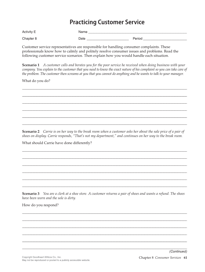 Copyright Goodheart-Willcox Co., Inc. May not be reproduced or posted to a publicly accessible website. Chapter 8 Consumer Services 61 Practicing Customer Service Activity E Name______________________________________________________________ Chapter 8 Date___________________________ Period____________________________ Customer service representatives are responsible for handling consumer complaints. These professionals know how to calmly and politely resolve consumer issues and problems. Read the following customer service scenarios. Then explain how you would handle each situation. Scenario 1 A customer calls and berates you for the poor service he received when doing business with your company. You explain to the customer that you need to know the exact nature of his complaint so you can take care of the problem. The customer then screams at you that you cannot do anything and he wants to talk to your manager. What do you do? _________________________________________________________________________________________________________ _________________________________________________________________________________________________________ _________________________________________________________________________________________________________ _________________________________________________________________________________________________________ _________________________________________________________________________________________________________ _________________________________________________________________________________________________________ Scenario 2 Carrie is on her way to the break room when a customer asks her about the sale price of a pair of shoes on display. Carrie responds, “That’s not my department,” and continues on her way to the break room. What should Carrie have done differently? _________________________________________________________________________________________________________ _________________________________________________________________________________________________________ _________________________________________________________________________________________________________ _________________________________________________________________________________________________________ _________________________________________________________________________________________________________ _________________________________________________________________________________________________________ Scenario 3 You are a clerk at a shoe store. A customer returns a pair of shoes and wants a refund. The shoes have been worn and the sole is dirty. How do you respond? _________________________________________________________________________________________________________ _________________________________________________________________________________________________________ _________________________________________________________________________________________________________ _________________________________________________________________________________________________________ _________________________________________________________________________________________________________ _________________________________________________________________________________________________________ (Continued)