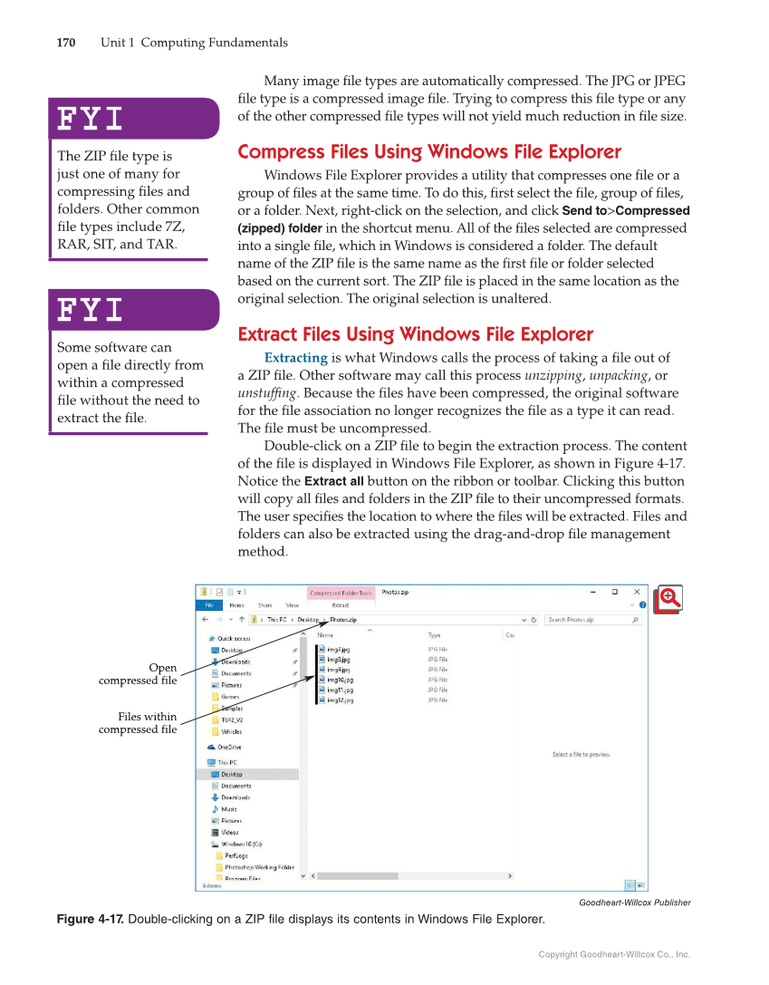Copyright Goodheart-Willcox Co., Inc. 170 Unit 1 Computing Fundamentals Many image fi le types are automatically compressed. The JPG or JPEG fi le type is a compressed image fi le. Trying to compress this fi le type or any of the other compressed fi le types will not yield much reduction in fi le size. Compress Files Using Windows File Explorer Windows File Explorer provides a utility that compresses one fi le or a group of fi les at the same time. To do this, fi rst select the fi le, group of fi les, or a folder. Next, right-click on the selection, and click Send to Compressed (zipped) folder in the shortcut menu. All of the fi les selected are compressed into a single fi le, which in Windows is considered a folder. The default name of the ZIP fi le is the same name as the fi rst fi le or folder selected based on the current sort. The ZIP fi le is placed in the same location as the original selection. The original selection is unaltered. Extract Files Using Windows File Explorer Extracting is what Windows calls the process of taking a fi le out of a ZIP fi le. Other software may call this process unzipping, unpacking, or unstuffi ng. Because the fi les have been compressed, the original software for the fi le association no longer recognizes the fi le as a type it can read. The fi le must be uncompressed. Double-click on a ZIP fi le to begin the extraction process. The content of the fi le is displayed in Windows File Explorer, as shown in Figure 4-17. Notice the Extract all button on the ribbon or toolbar. Clicking this button will copy all fi les and folders in the ZIP fi le to their uncompressed formats. The user specifi es the location to where the fi les will be extracted. Files and folders can also be extracted using the drag-and-drop fi le management method. FYI FYI The ZIP fi le type is just one of many for compressing fi les and folders. Other common fi le types include 7Z, RAR, SIT, and TAR. FYI FYI Some software can open a fi le directly from within a compressed fi le without the need to extract the fi le. Files within compressed file Open compressed file Goodheart-Willcox Publisher Figure 4-17. Double-clicking on a ZIP file displays its contents in Windows File Explorer.