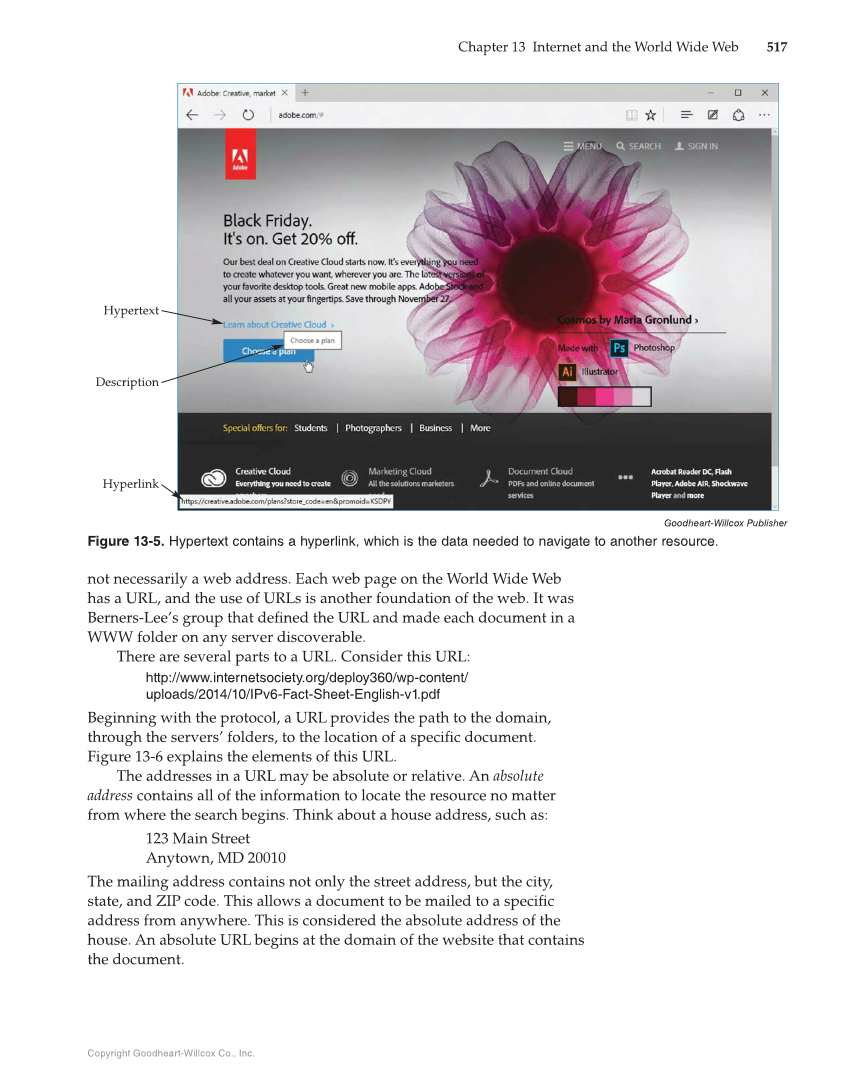 Copyright Goodheart-Willcox Co., Inc. Chapter 13 Internet and the World Wide Web 517 not necessarily a web address. Each web page on the World Wide Web has a URL, and the use of URLs is another foundation of the web. It was Berners-Lee’s group that defi ned the URL and made each document in a WWW folder on any server discoverable. There are several parts to a URL. Consider this URL: http://www.internetsociety.org/deploy360/wp-content/ uploads/2014/10/IPv6-Fact-Sheet-English-v1.pdf Beginning with the protocol, a URL provides the path to the domain, through the servers’ folders, to the location of a specifi c document. Figure 13-6 explains the elements of this URL. The addresses in a URL may be absolute or relative. An absolute address contains all of the information to locate the resource no matter from where the search begins. Think about a house address, such as: 123 Main Street Anytown, MD 20010 The mailing address contains not only the street address, but the city, state, and ZIP code. This allows a document to be mailed to a specifi c address from anywhere. This is considered the absolute address of the house. An absolute URL begins at the domain of the website that contains the document. Hypertext Hyperlink Description Goodheart-Willcox Publisher Figure 13-5. Hypertext contains a hyperlink, which is the data needed to navigate to another resource.